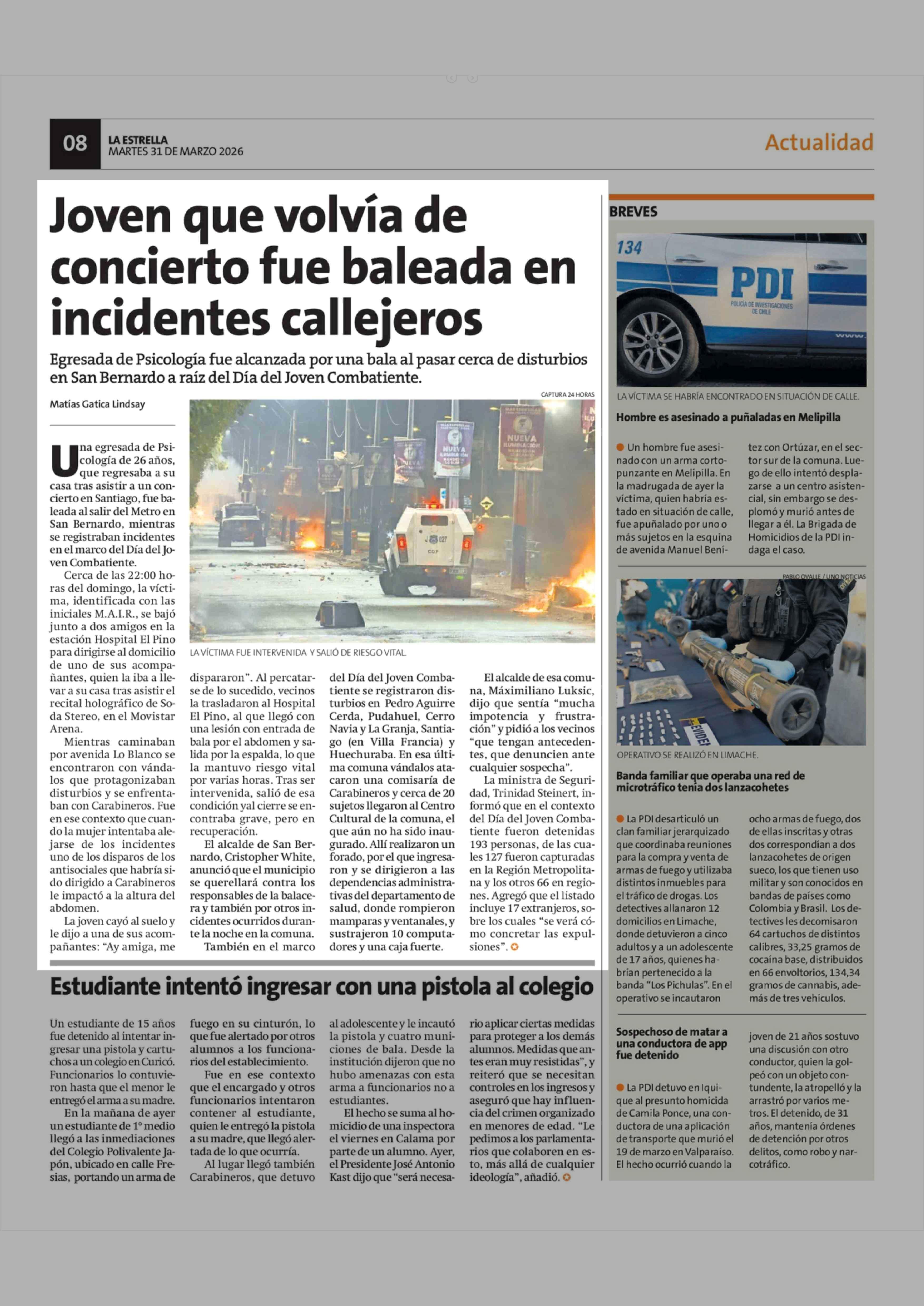 Joven que volvía de concierto fue baleada en incidentes callejeros 31-03-2026 La Estrella de Concepción |