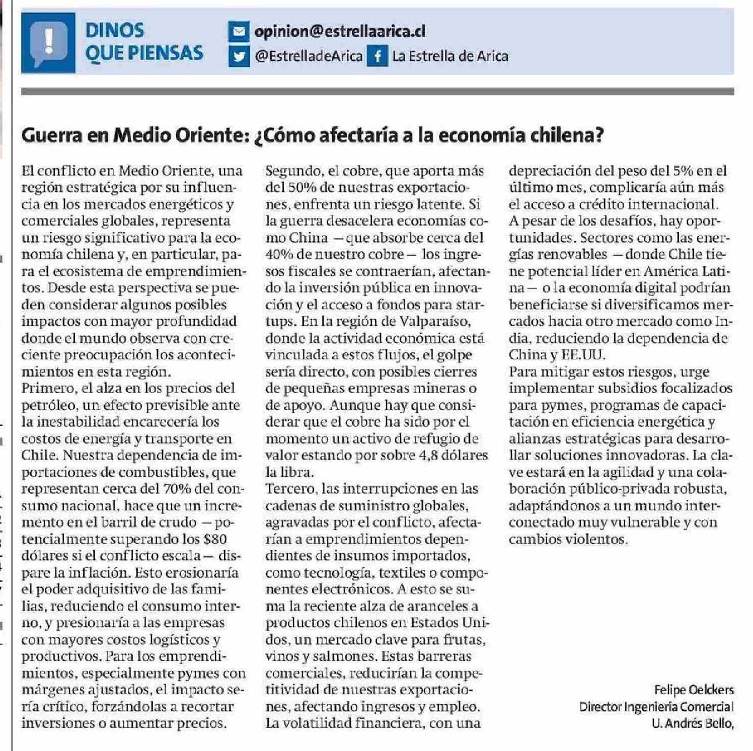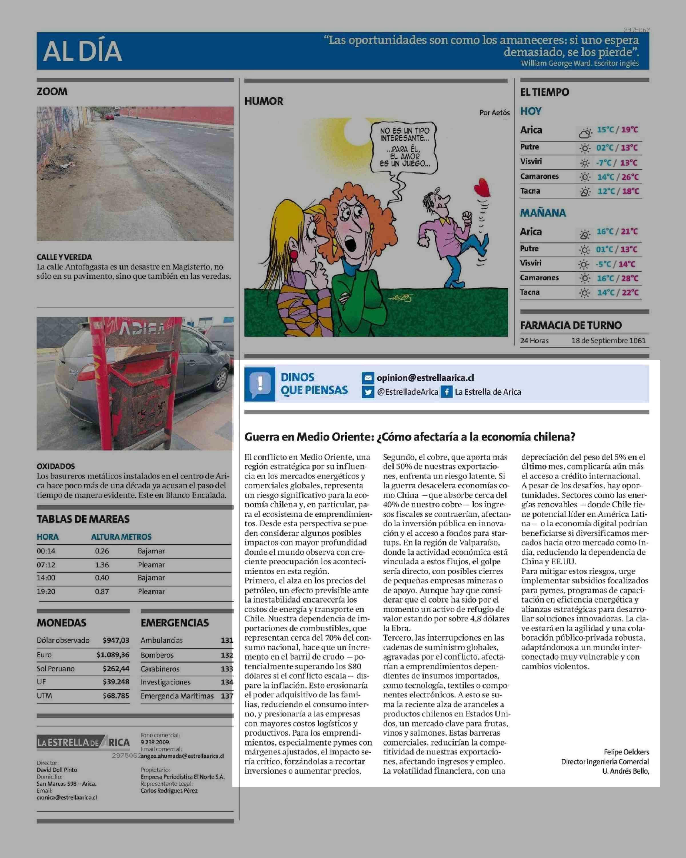 Guerra en Medio Oriente: ¿ Cómo afectaría a la economía chilena? 23-06-2025 La Estrella de Arica |