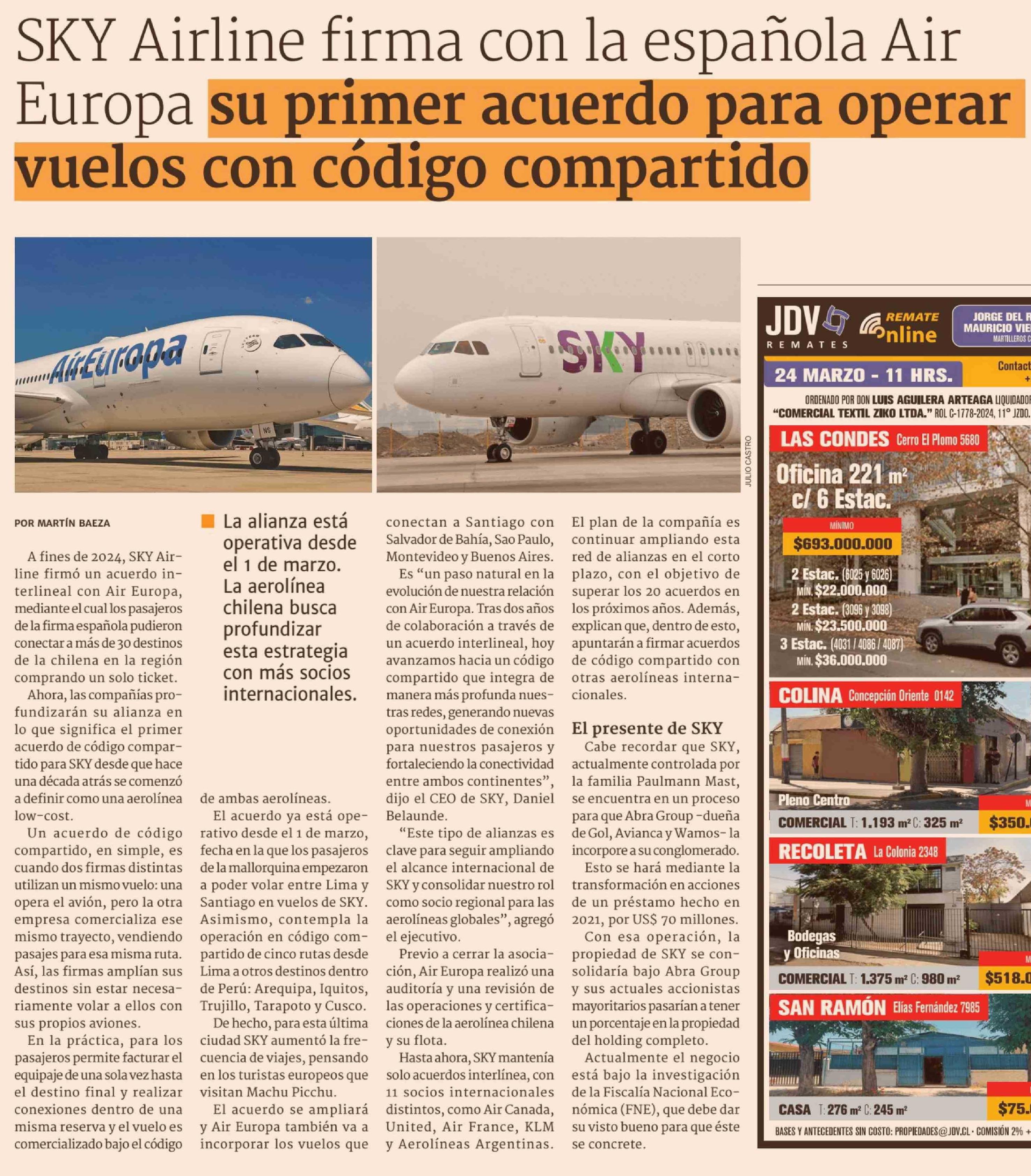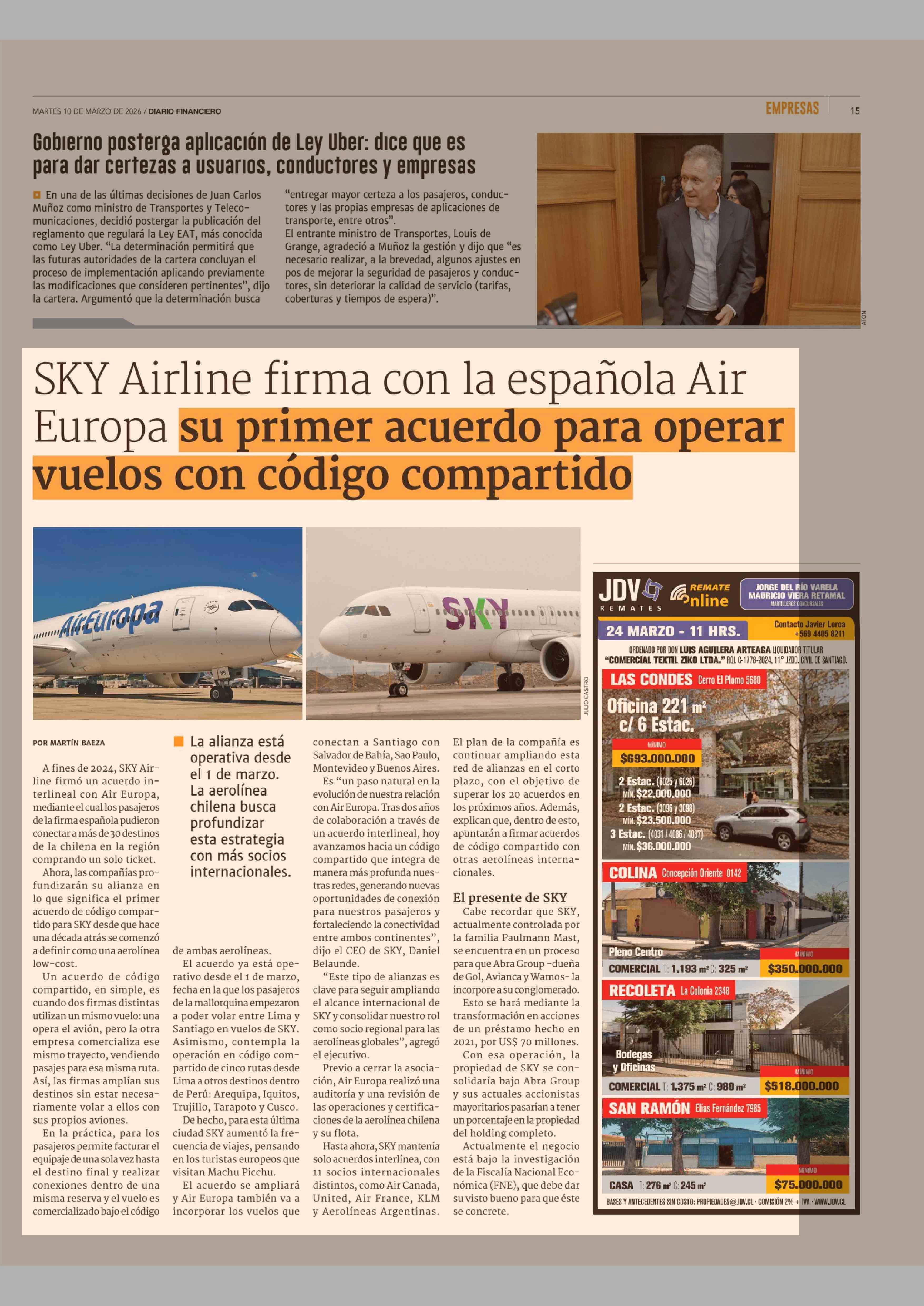 SKY Airline firma con la española Air Europa su primer acuerdo para operar vuelos con código compartido 10-03-2026 Diario Financiero |