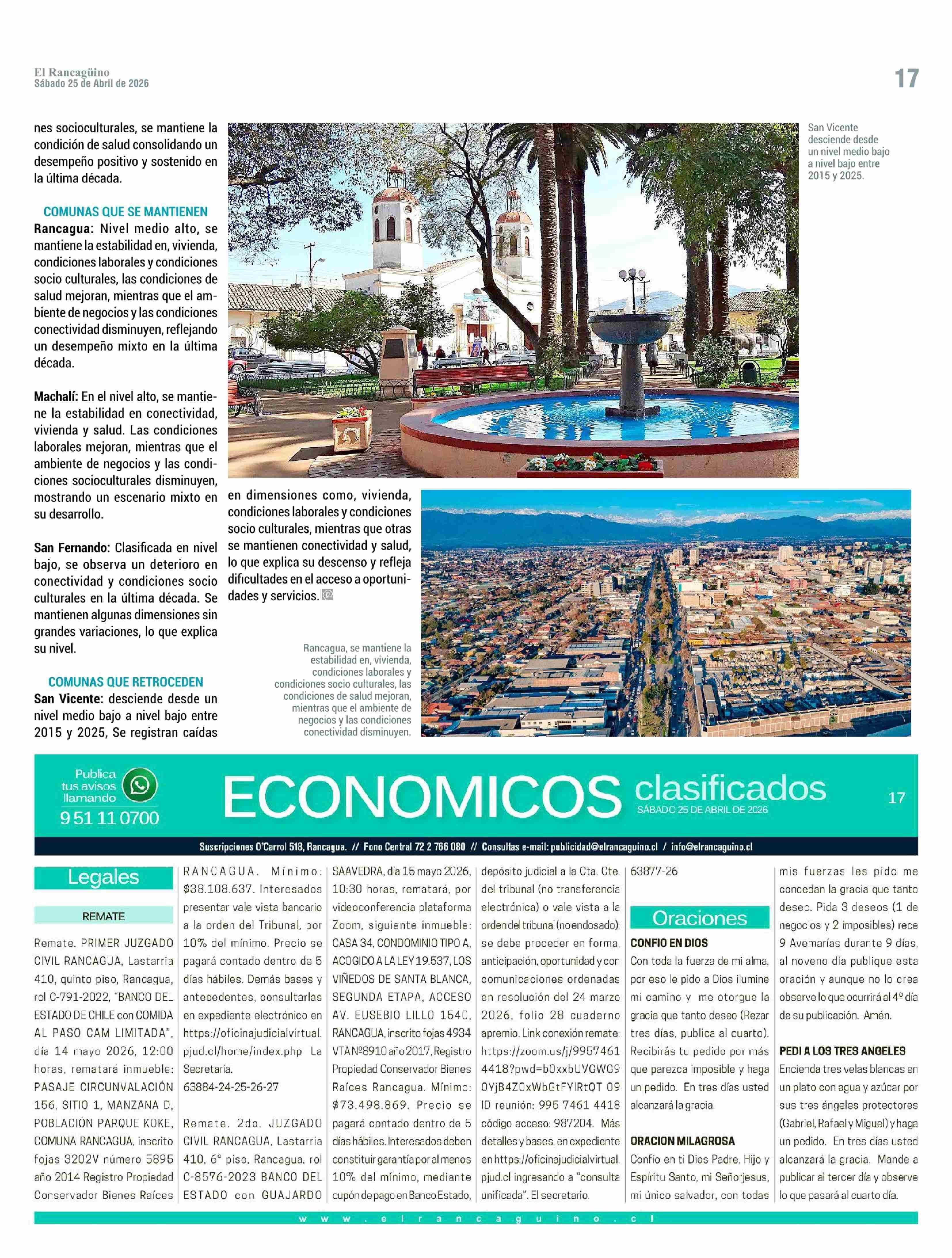 RENGO DESTACA POR AVANCES SOSTENIDOS EN CALIDAD URBANA 25-04-2026 El Rancagüino |