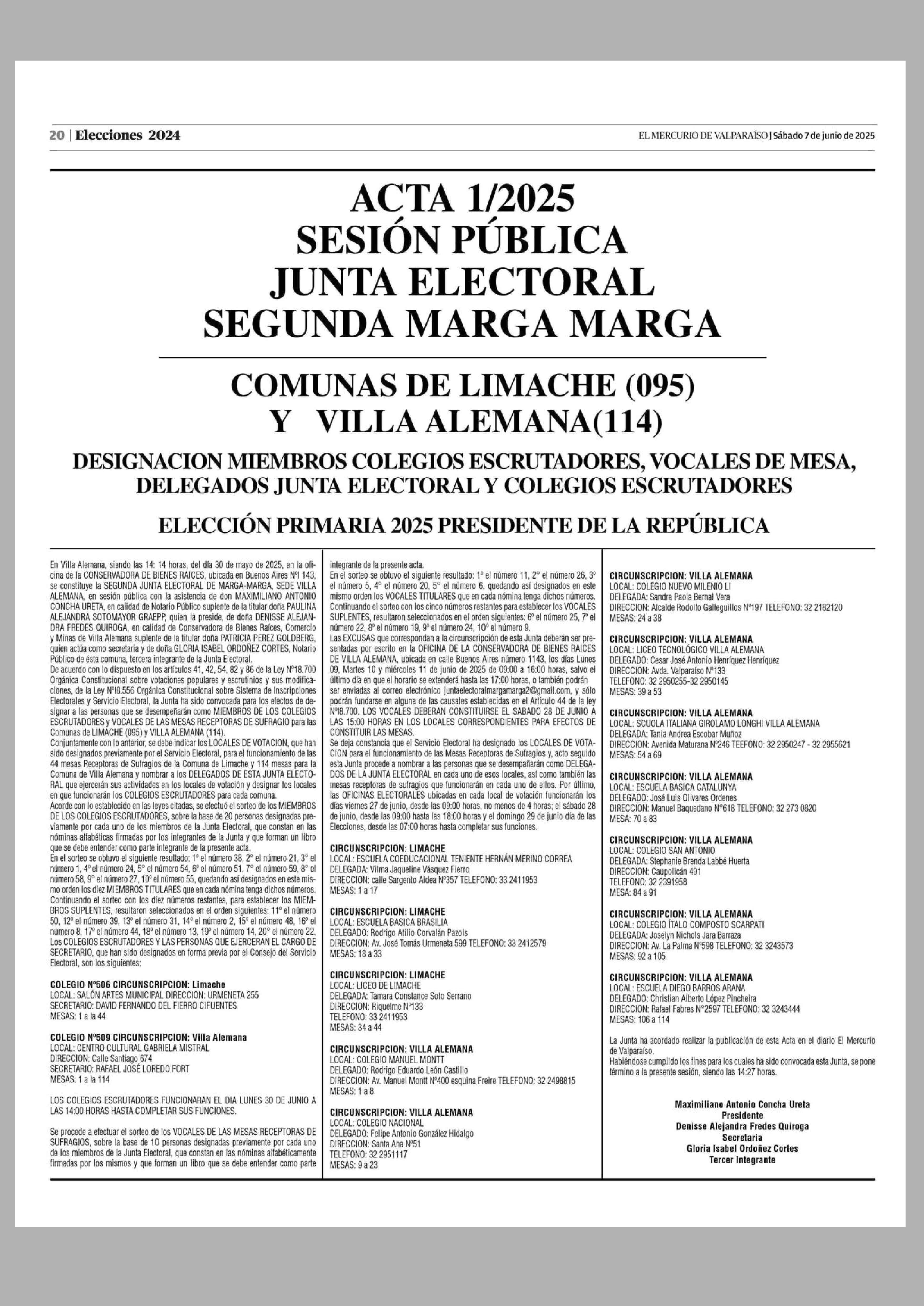 ACTA 112025 SESIÓN PÚBLICA JUNTA ELECTORAL SEGUNDA MARGA MARGA 07-06-2025 El Mercurio de Valparaíso |