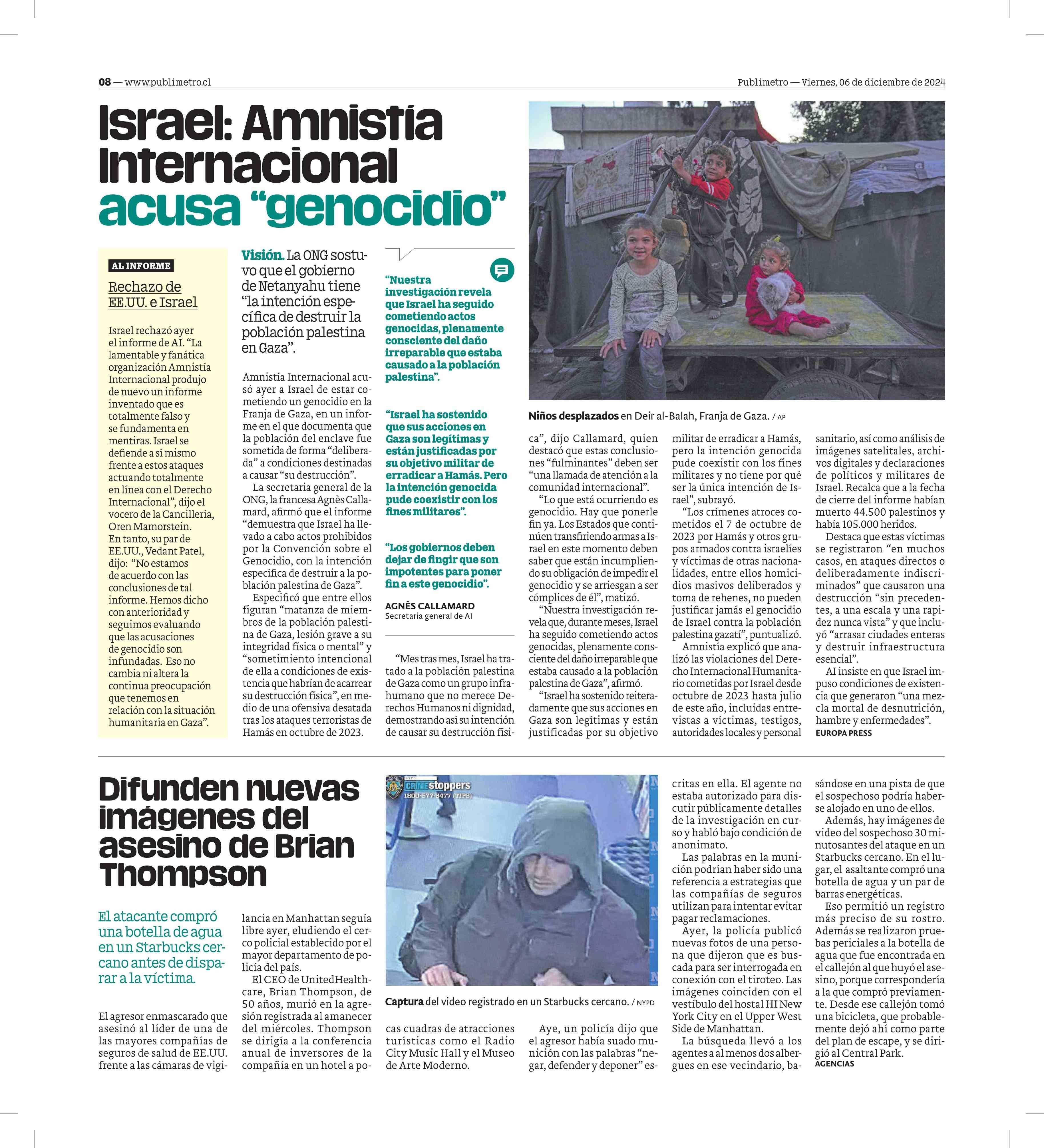 Israel: Amnistía Internacional acusa “genocidio” 06-12-2024 Publimetro |