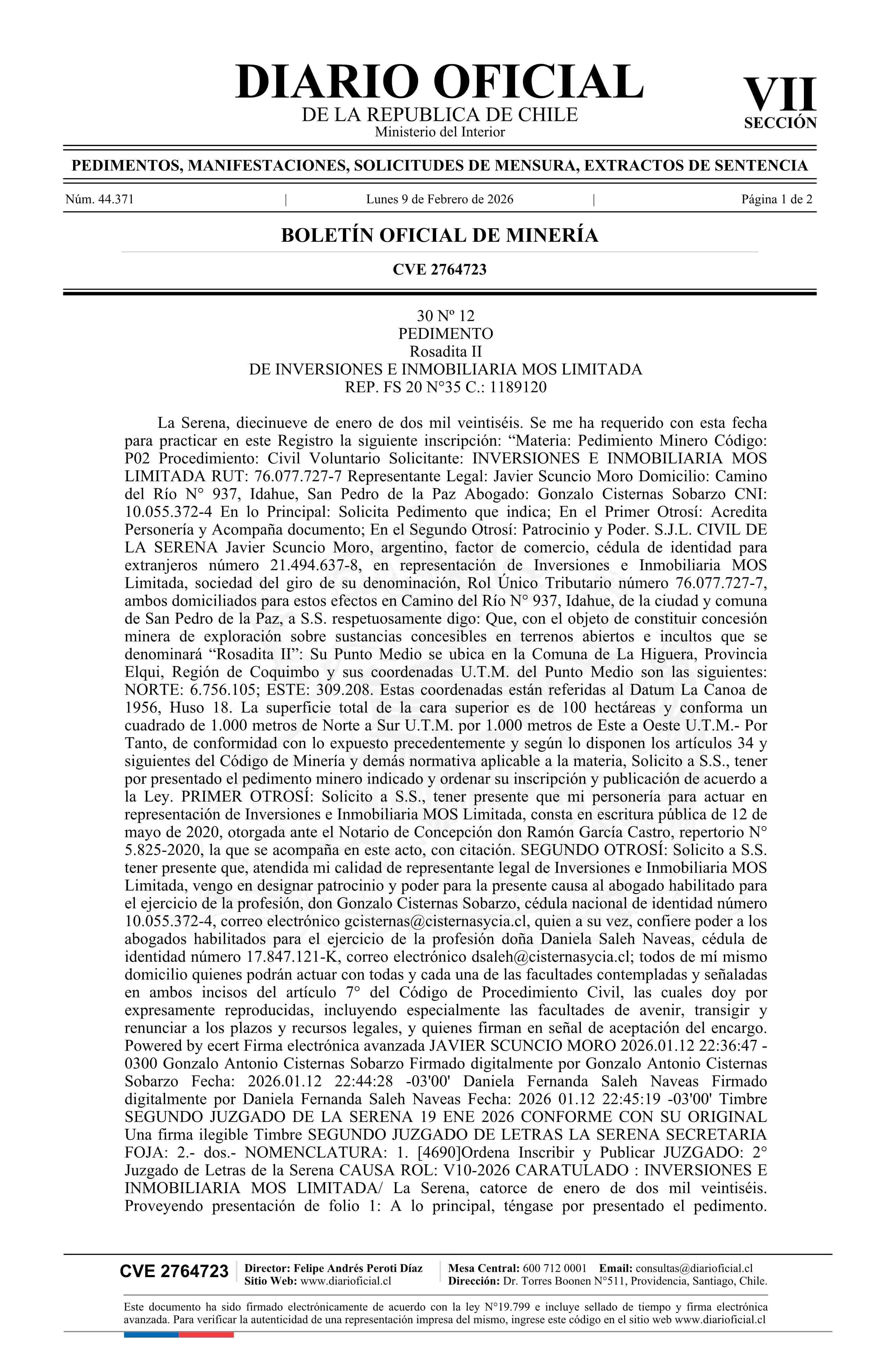 Rosadita II / Inversiones e Inmobiliaria Mos Limitada 09-02-2026 DIARIO OFICIAL CHILE - BOLETÍN OFICIAL DE MINERÍA |