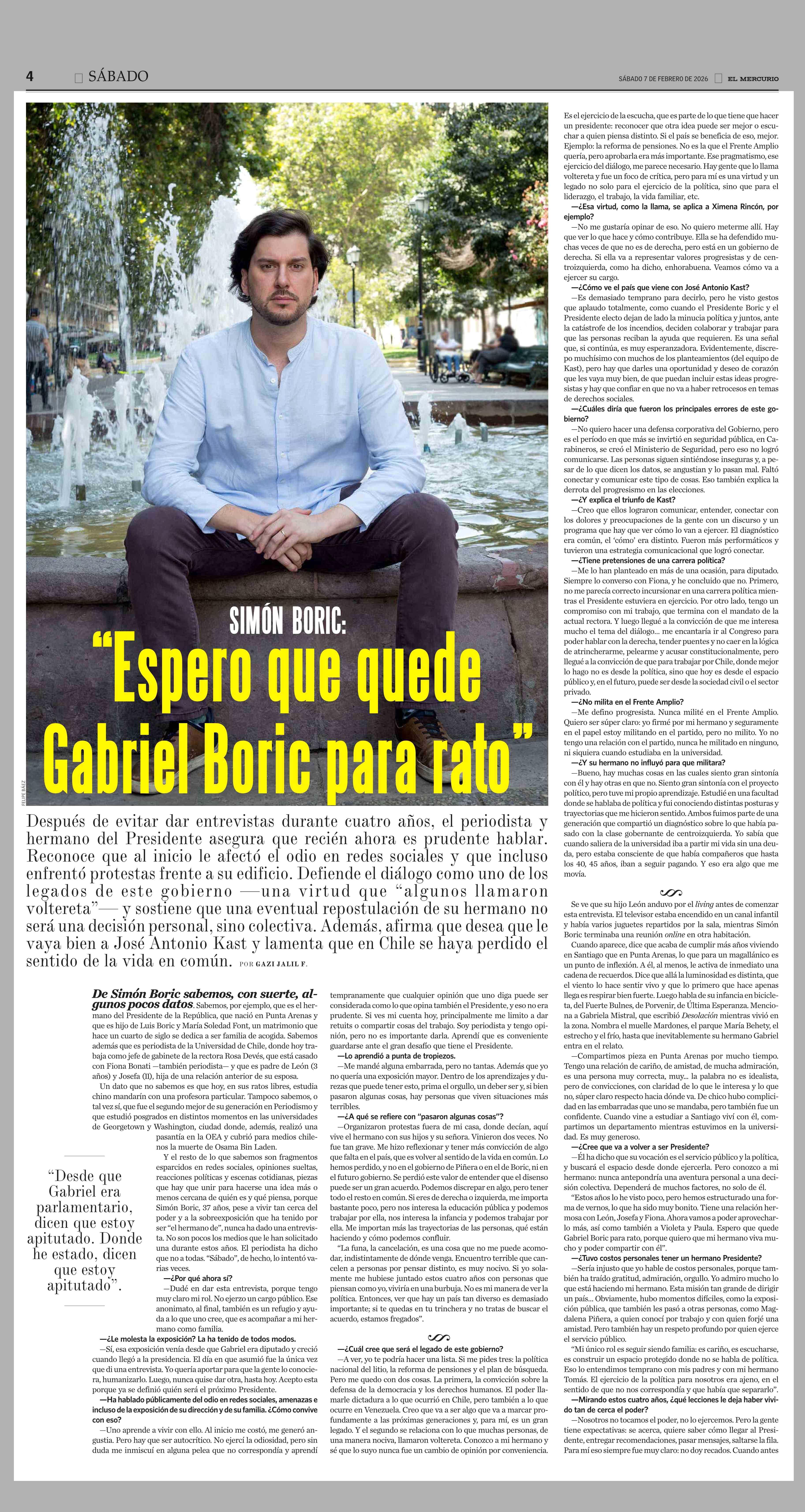 “Espero que quede Gabriel Boric para rato” 07-02-2026 El Mercurio |