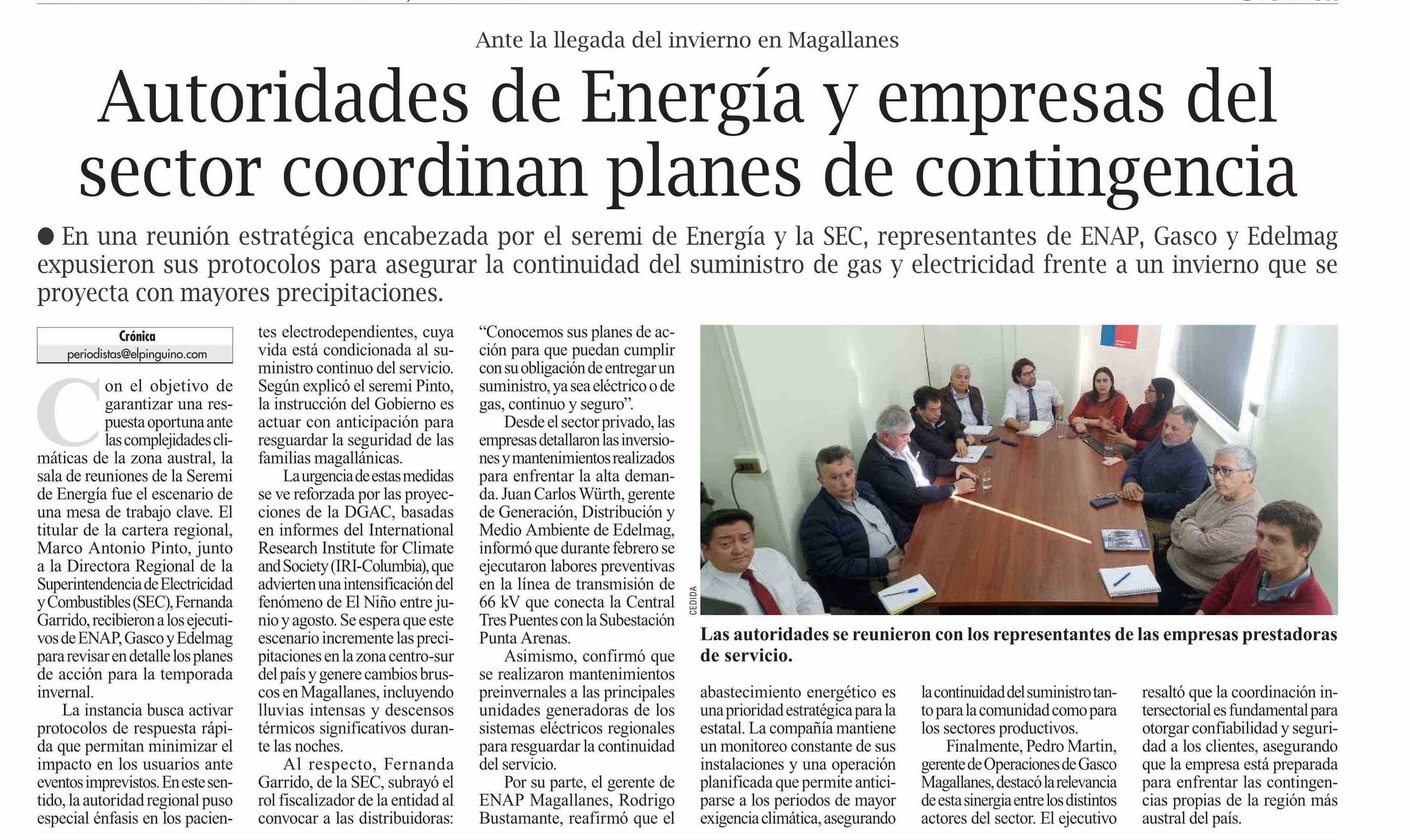 Autoridades de Energía y empresas del sector coordinan planes de contingencia 11-04-2026 El Pingüino |