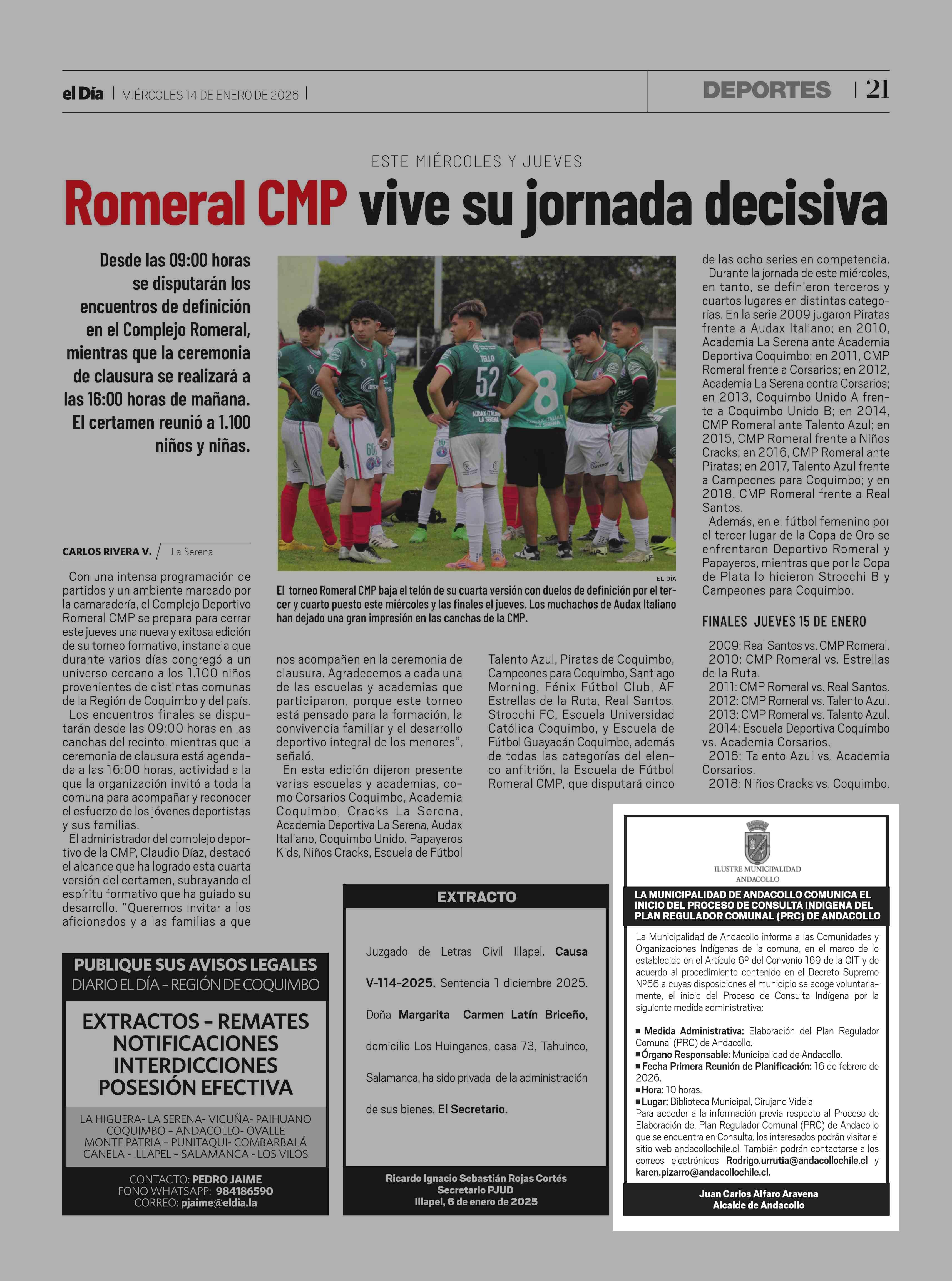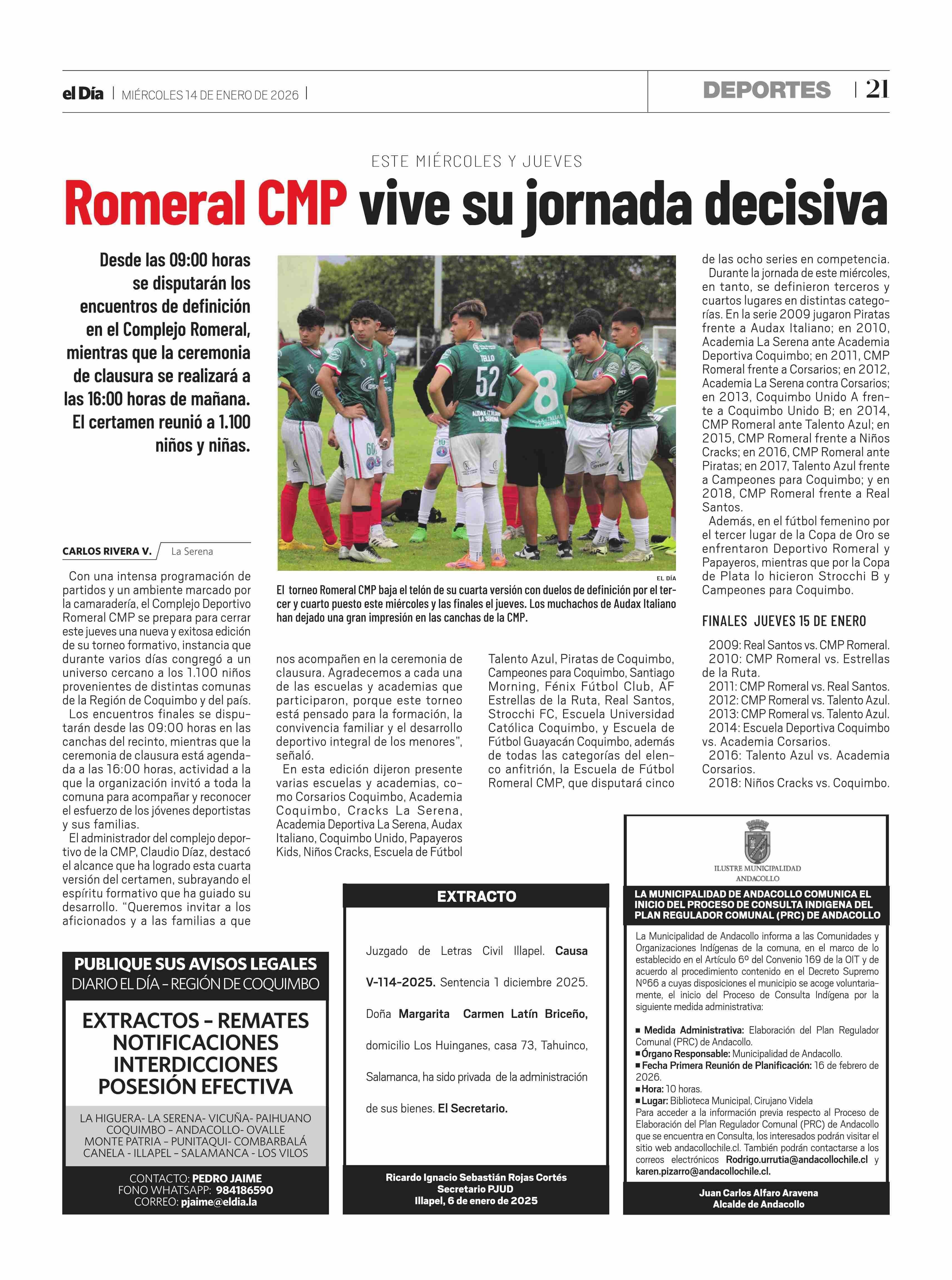 EXTRACTO: ILUSTRE MUNICIPALIDAD ANDACOLLO LA MUNICIPALIDAD DE ANDACOLLO COMUNICA EL INICIO DEL PROCESO DE CONSULTA INDIGENA DEL PLAN REGULADOR COMUNAL (PRC) DE ANDACOLLO 14-01-2026 El Día |