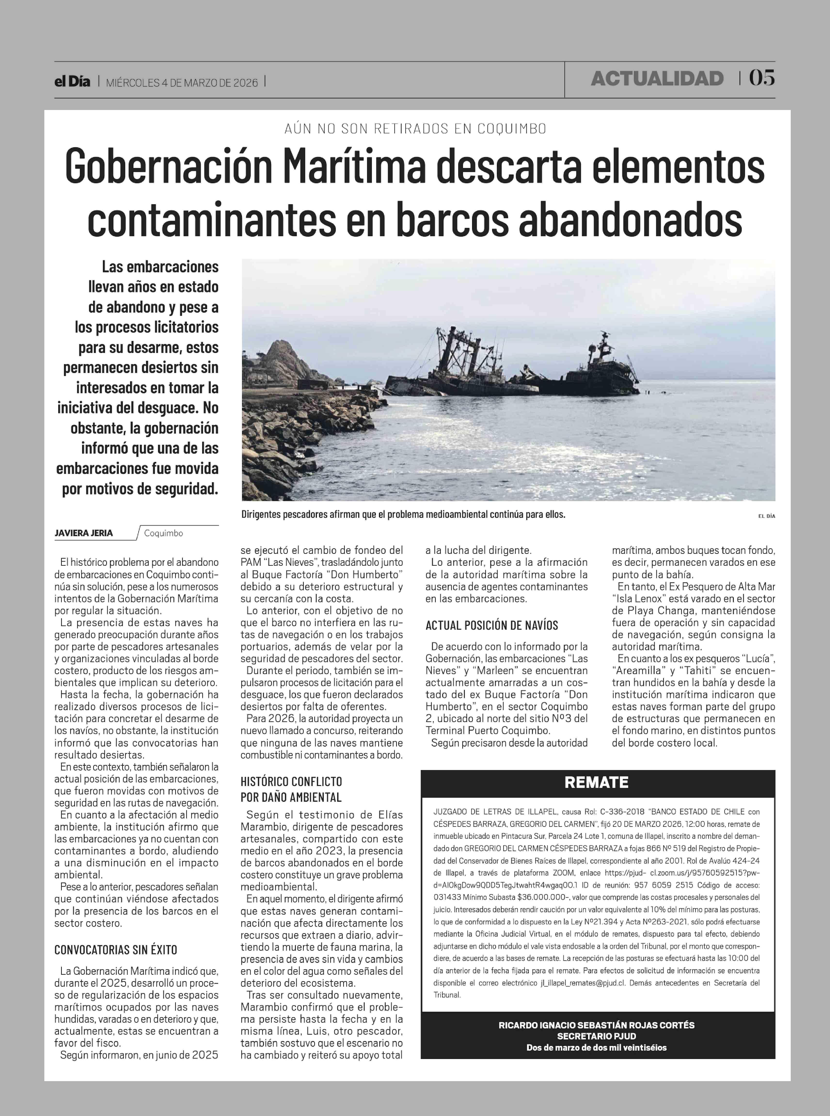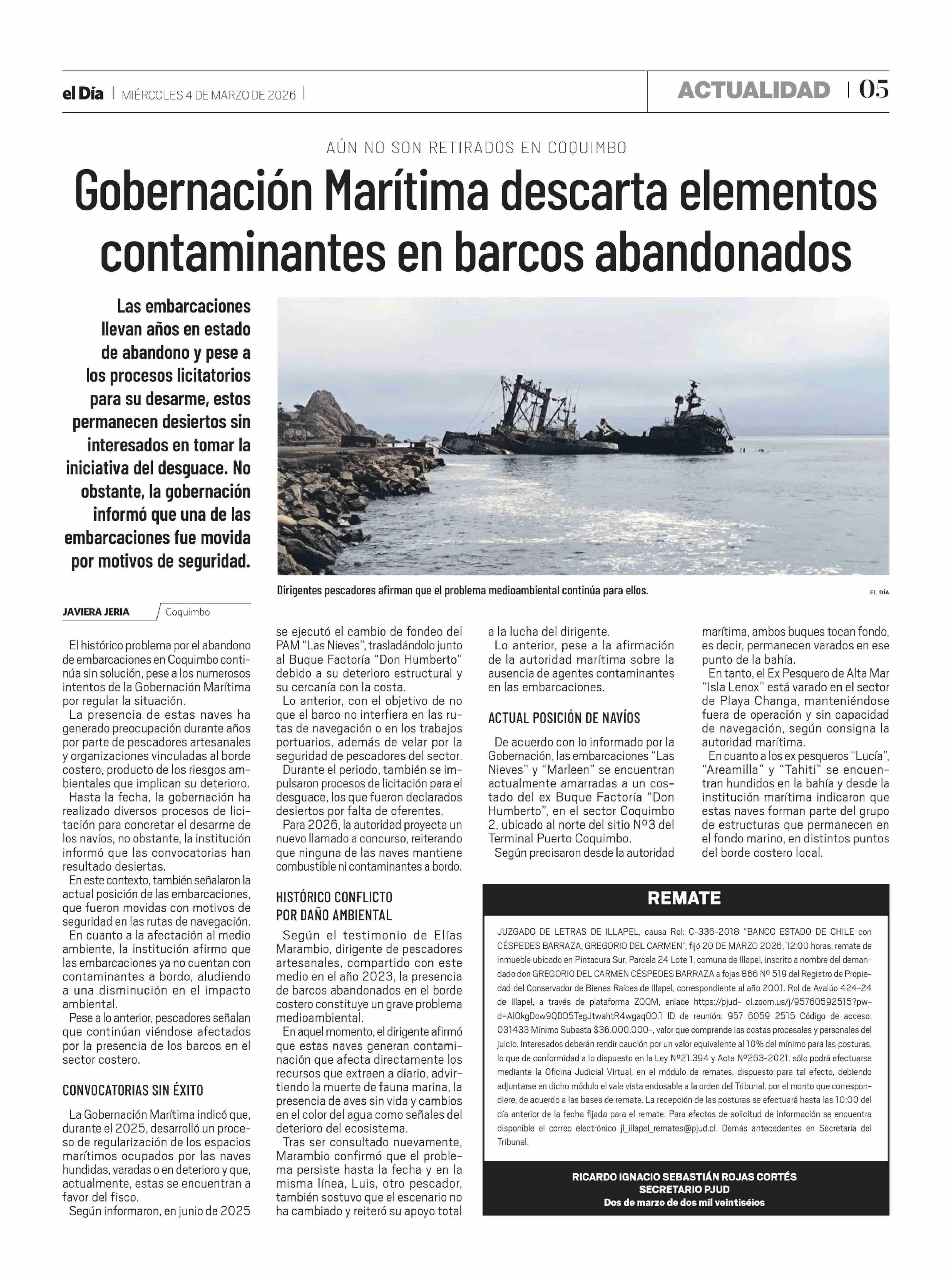 Gobernación Marítima descarta elementos contaminantes en barcos abandonados 04-03-2026 El Día |