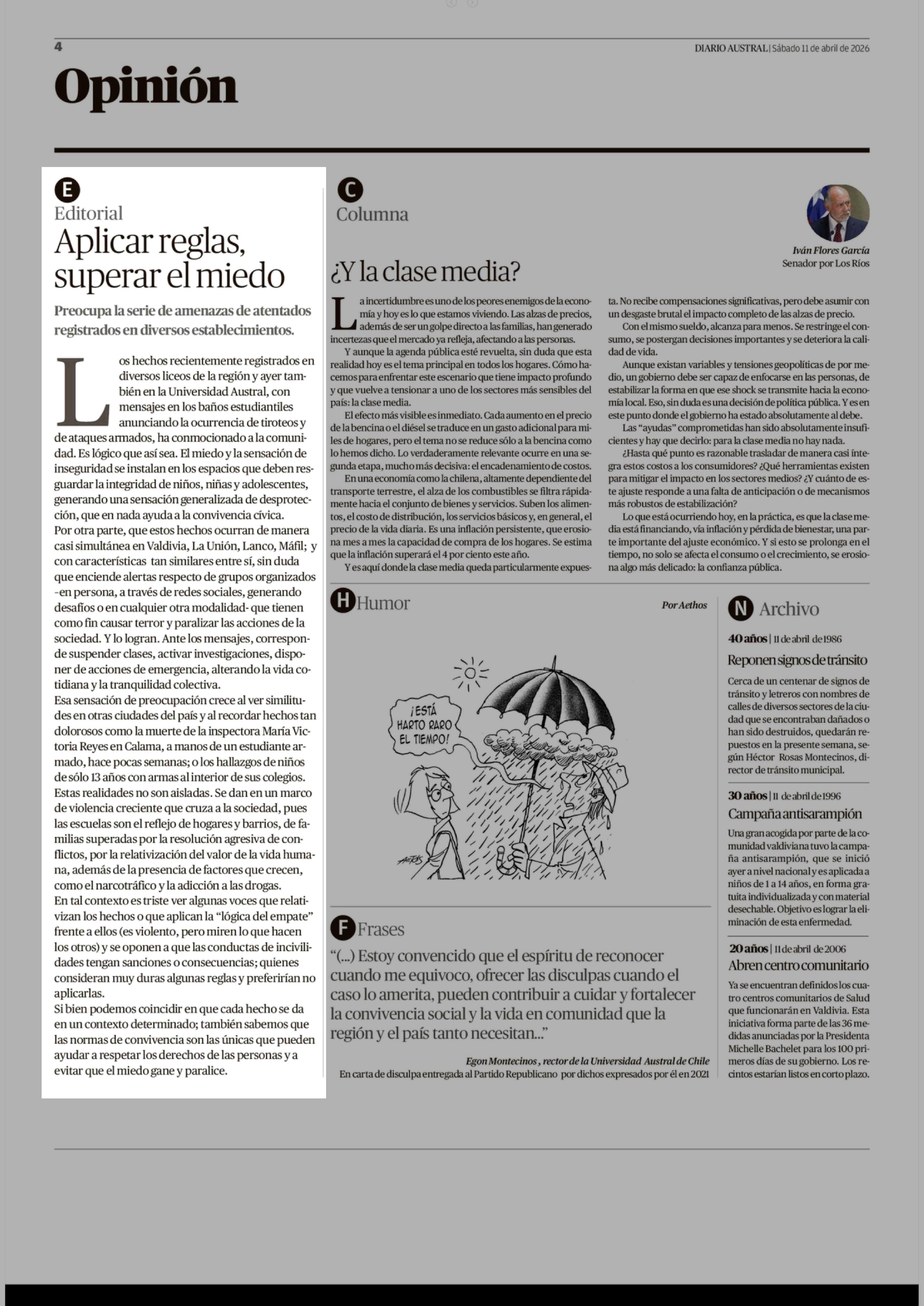 Editorial: Aplicar reglas, superar el miedo 11-04-2026 Diario Austral Región de Los Ríos |