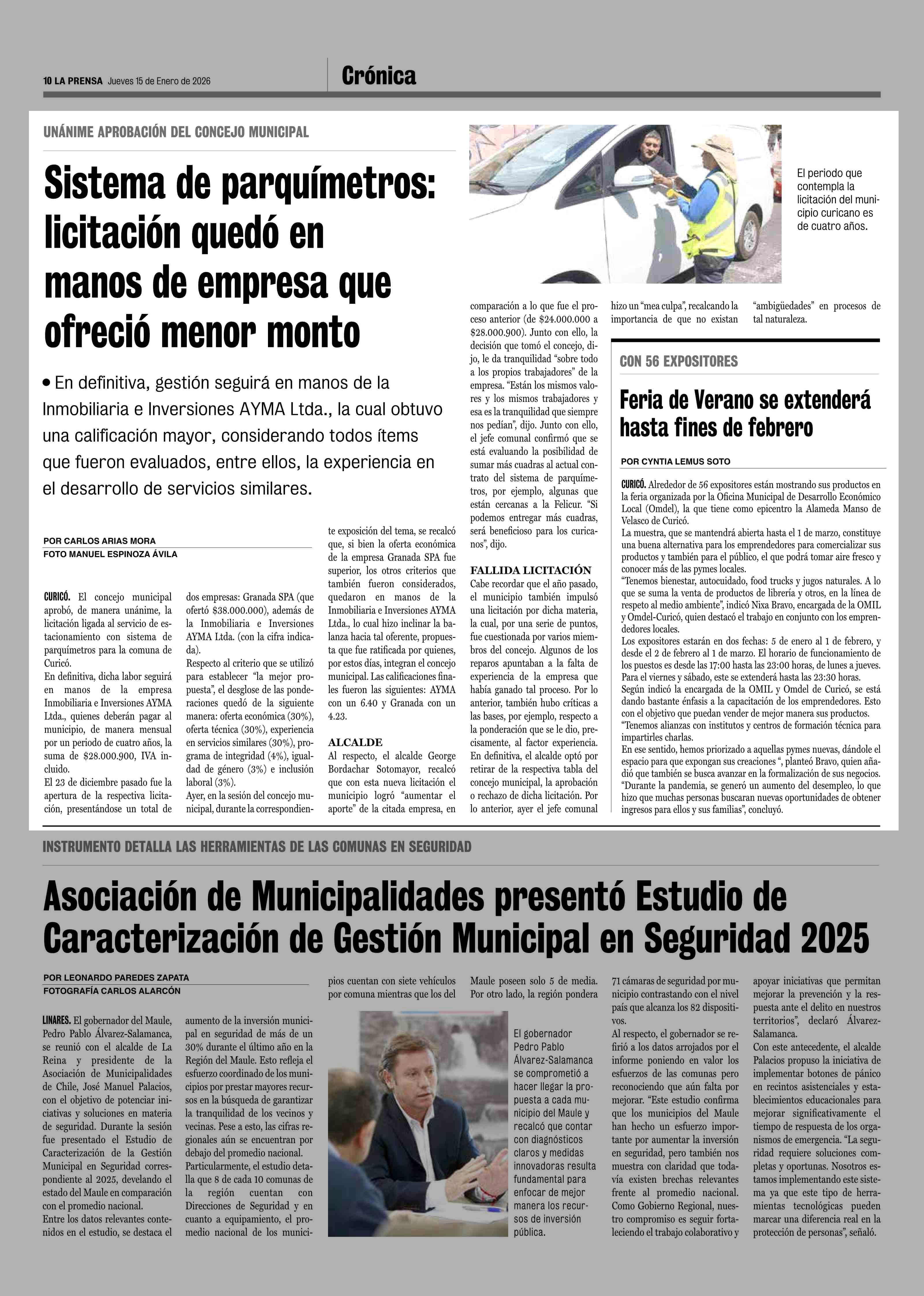 Sistema de parquímetros: licitación quedó en manos de empresa que ofreció menor monto 15-01-2026 La Prensa de Curicó |