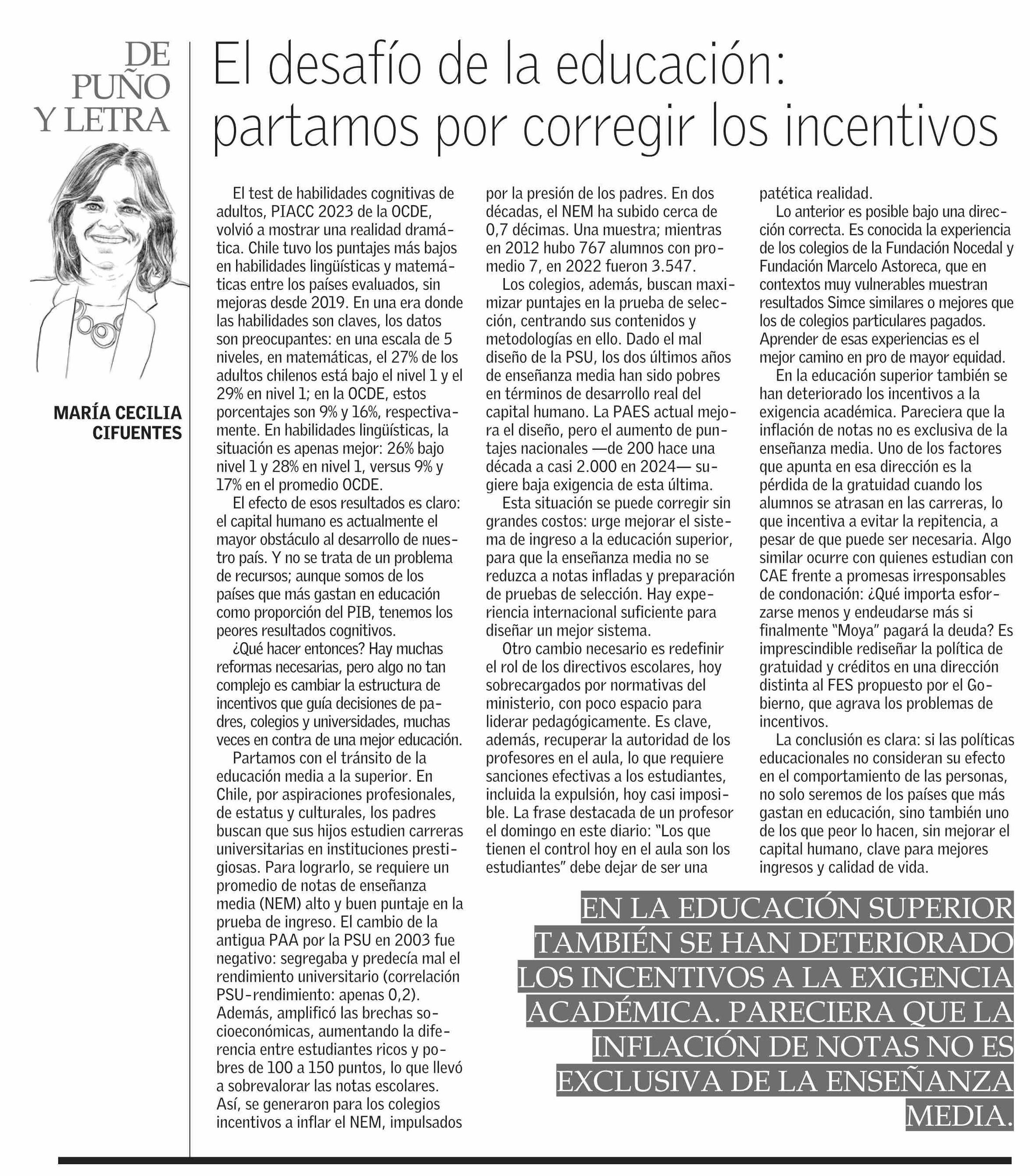 COLUMNAS DE OPINIÓN: partamos por corregir los incentivos 23-04-2025 El Mercurio |