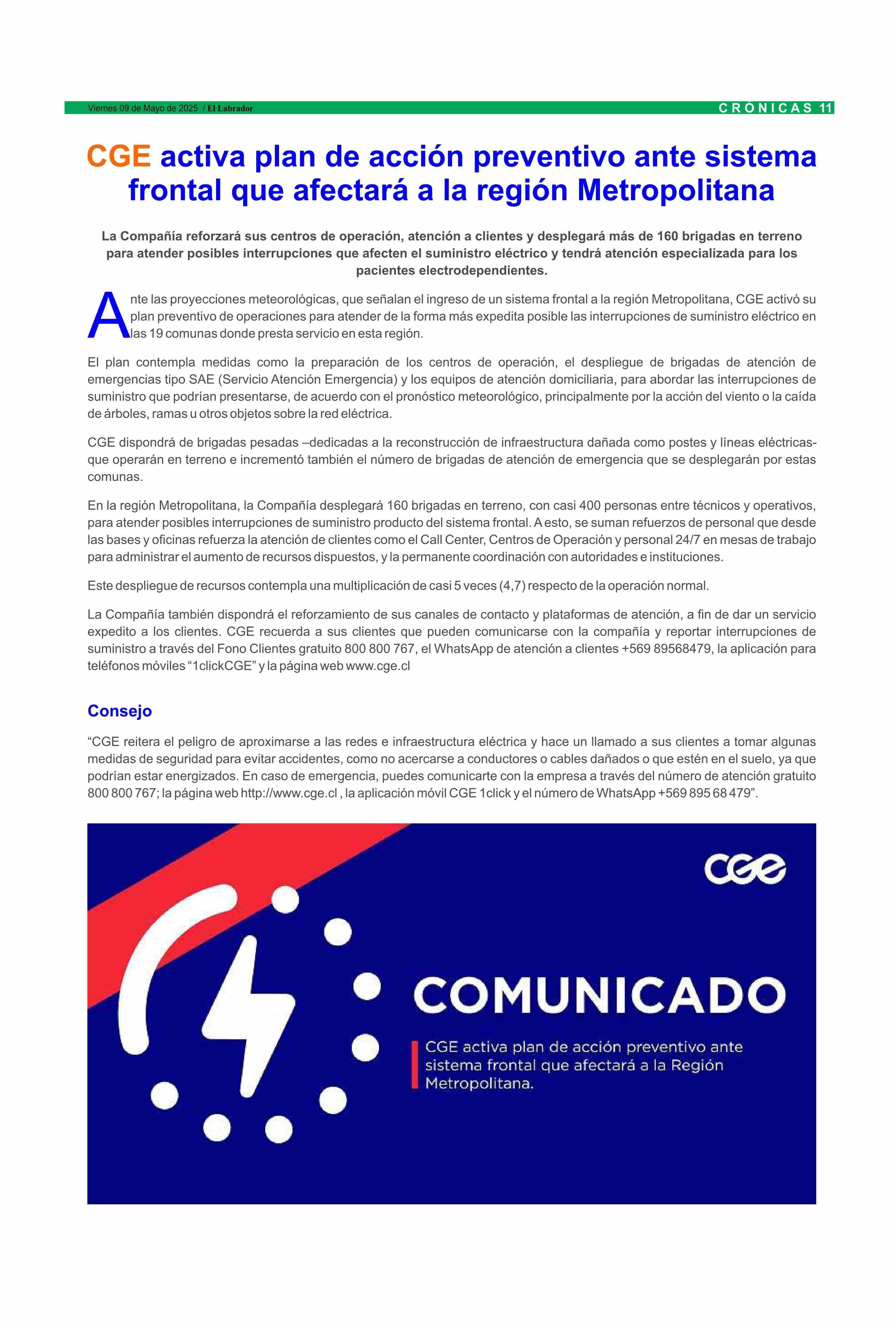 CGE activa plan de acción preventivo ante sistema frontal que afectará a la región Metropolitana 09-05-2025 El Labrador |