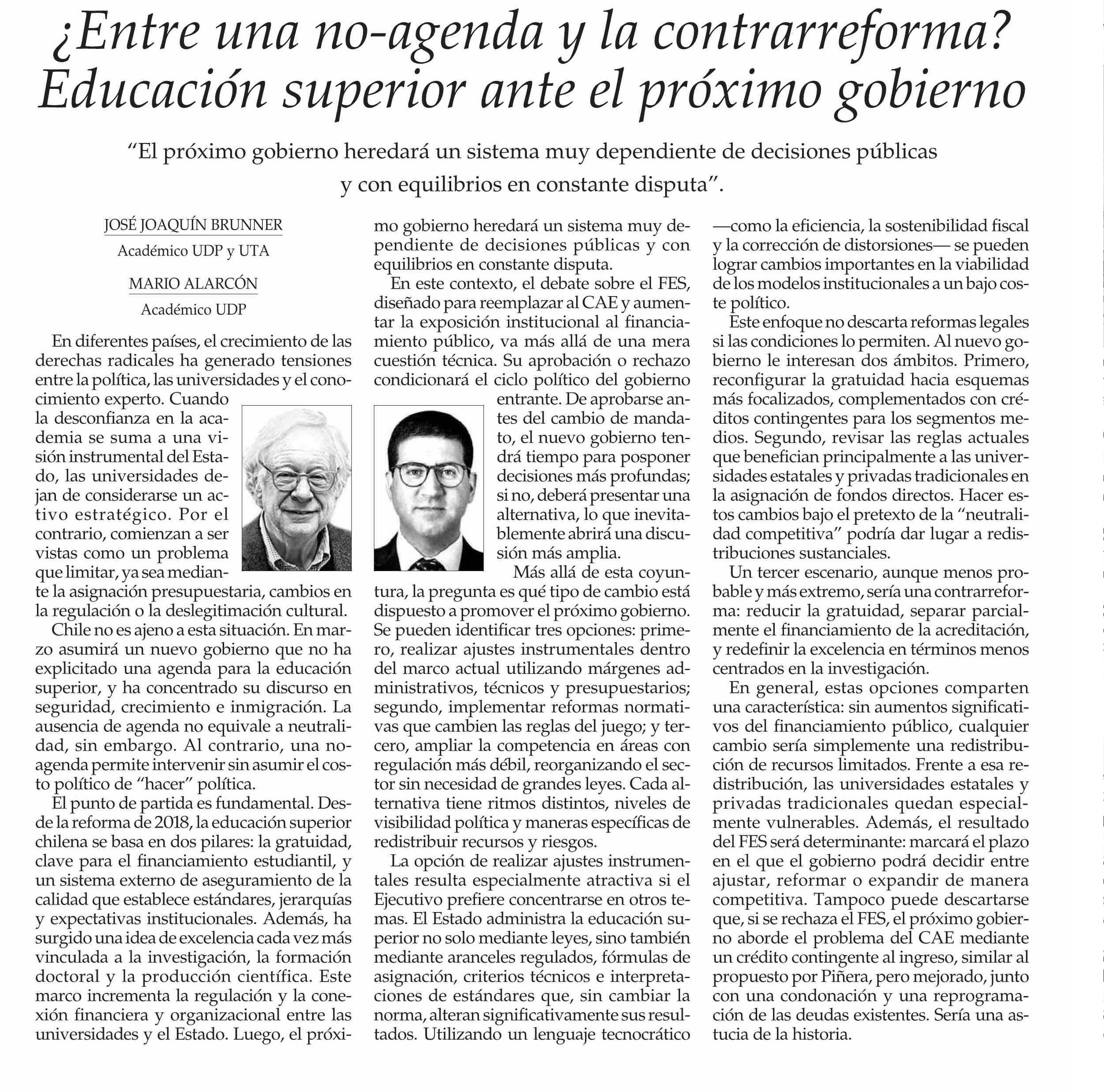 COLUMNAS DE OPINIÓN: ¿Entre una no-agenda y la contrarreforma? Educación superior ante el próximo gobierno 22-01-2026 El Mercurio |