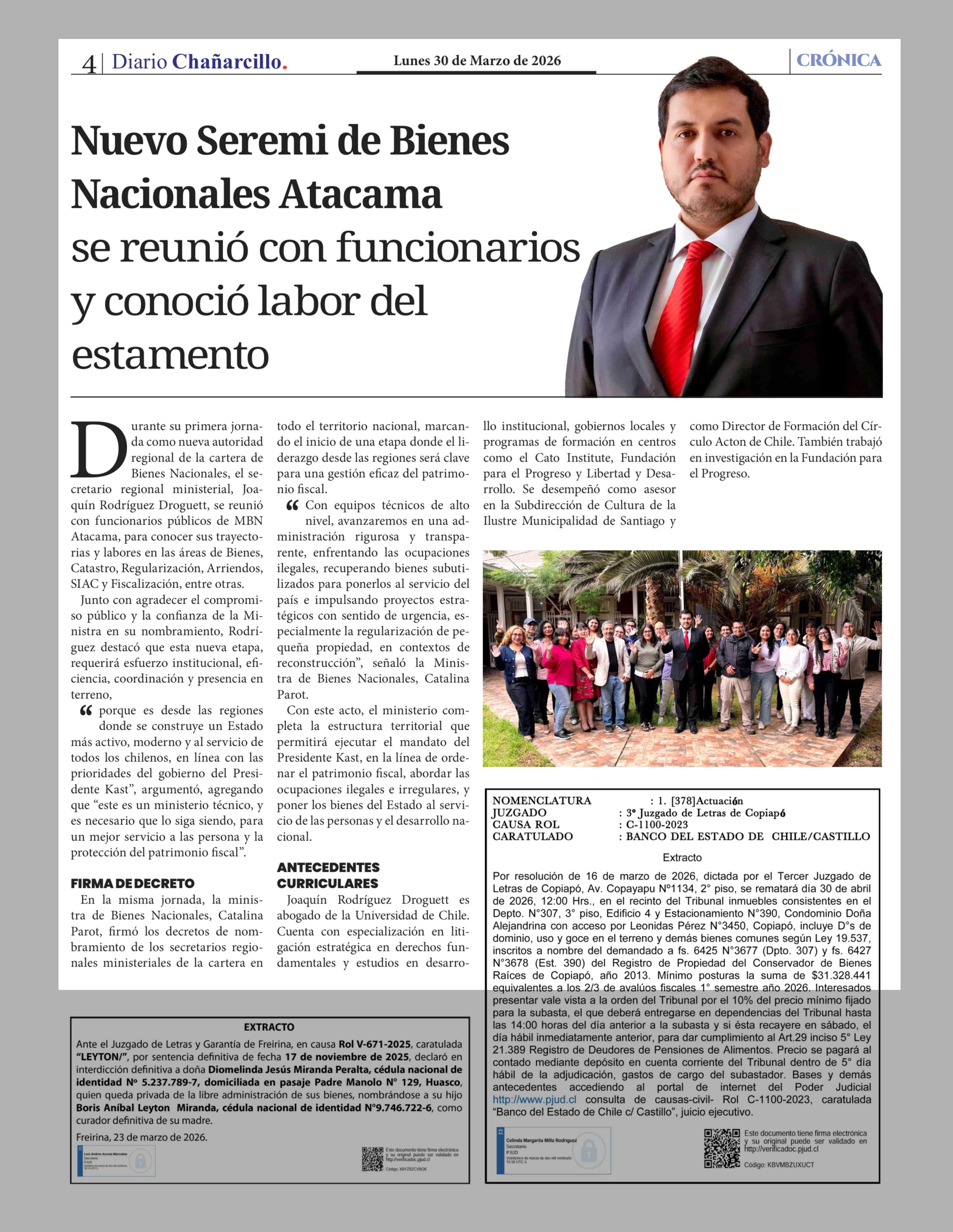 Nuevo Seremi de Bienes Nacionales Atacama se reunió con funcionarios y conoció labor del estamento 30-03-2026 Diario Chañarcillo |