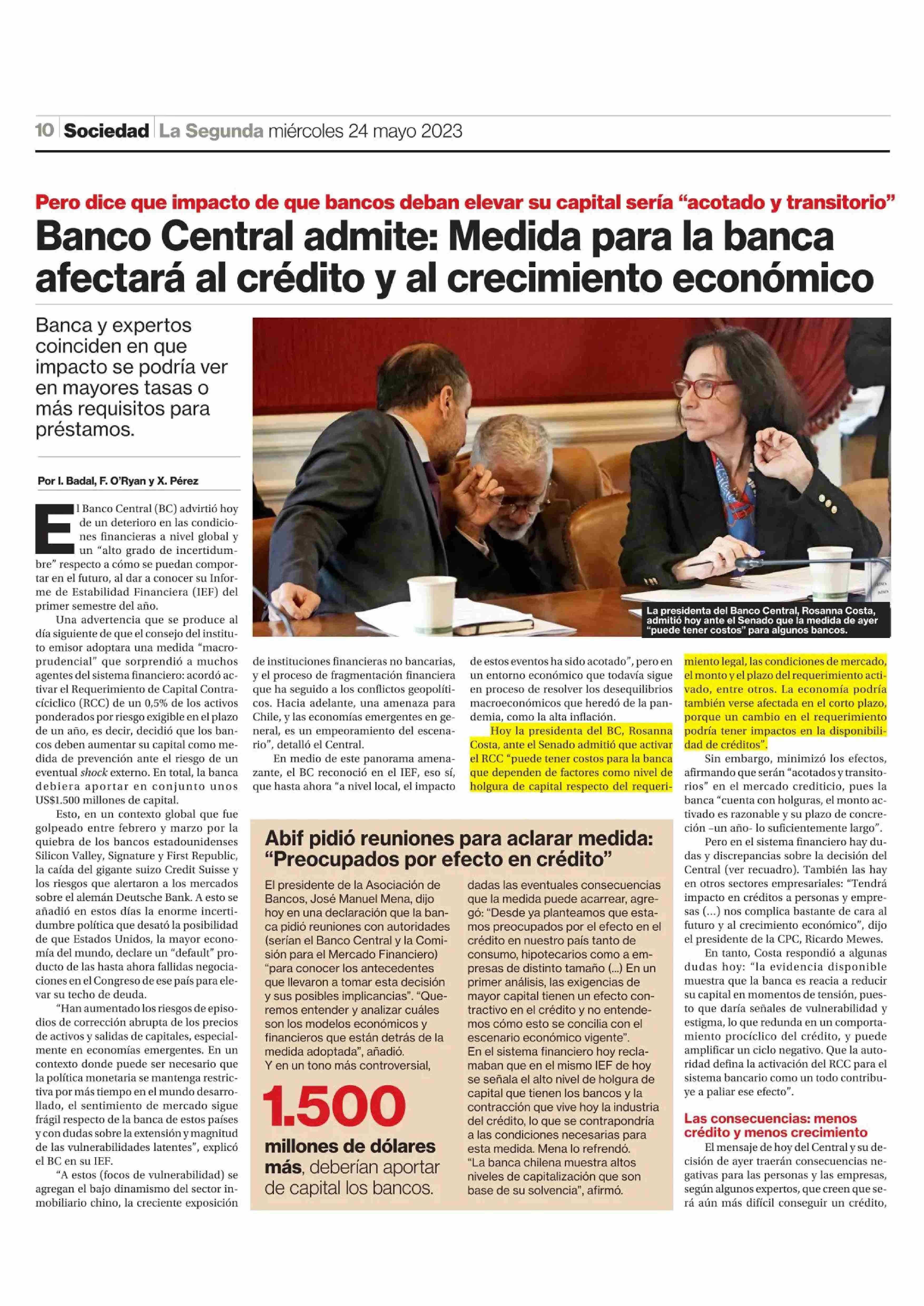 Banco Central admite: Medida para la banca afectará al crédito y al crecimiento económico 24-05-2023 La Segunda |