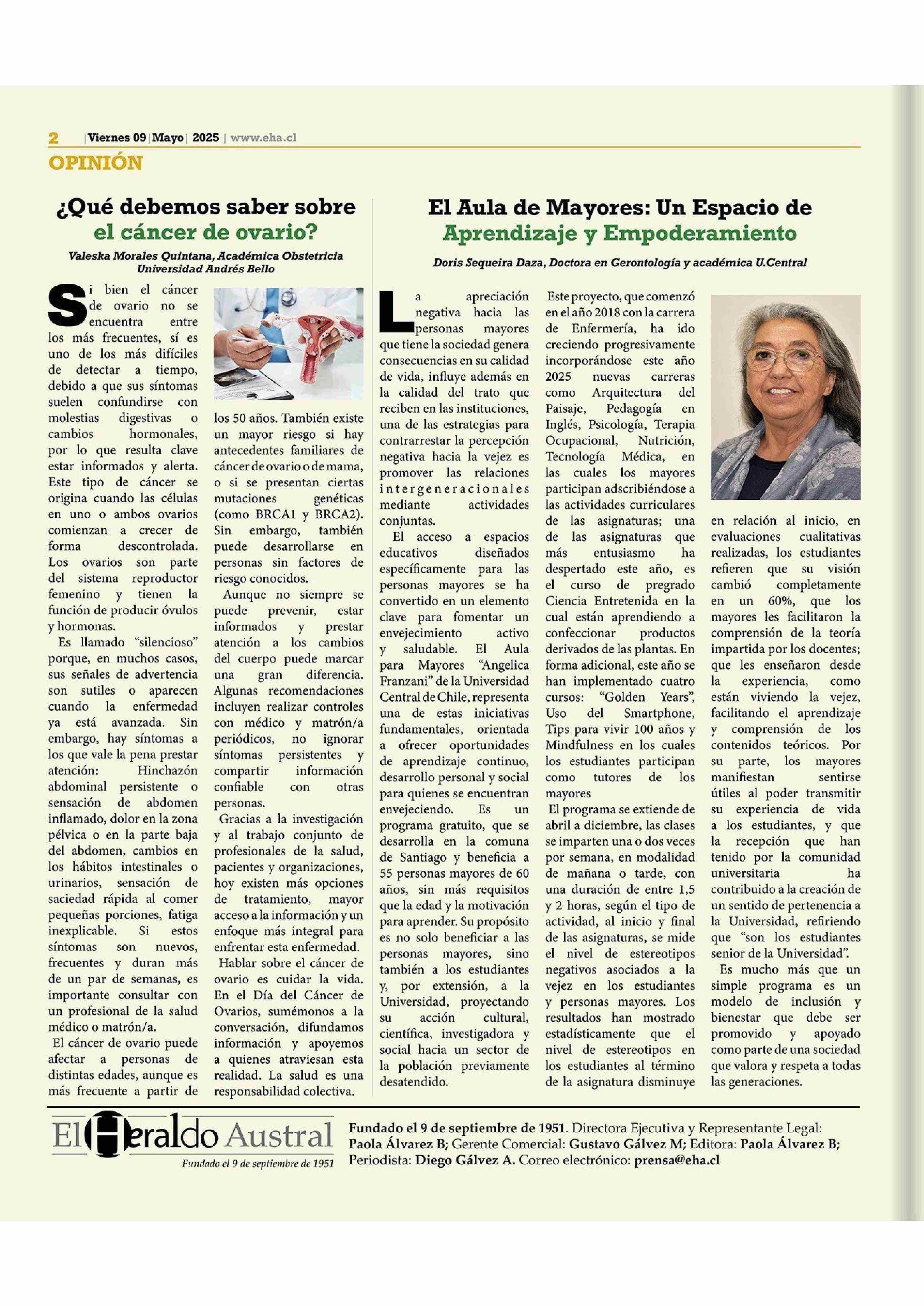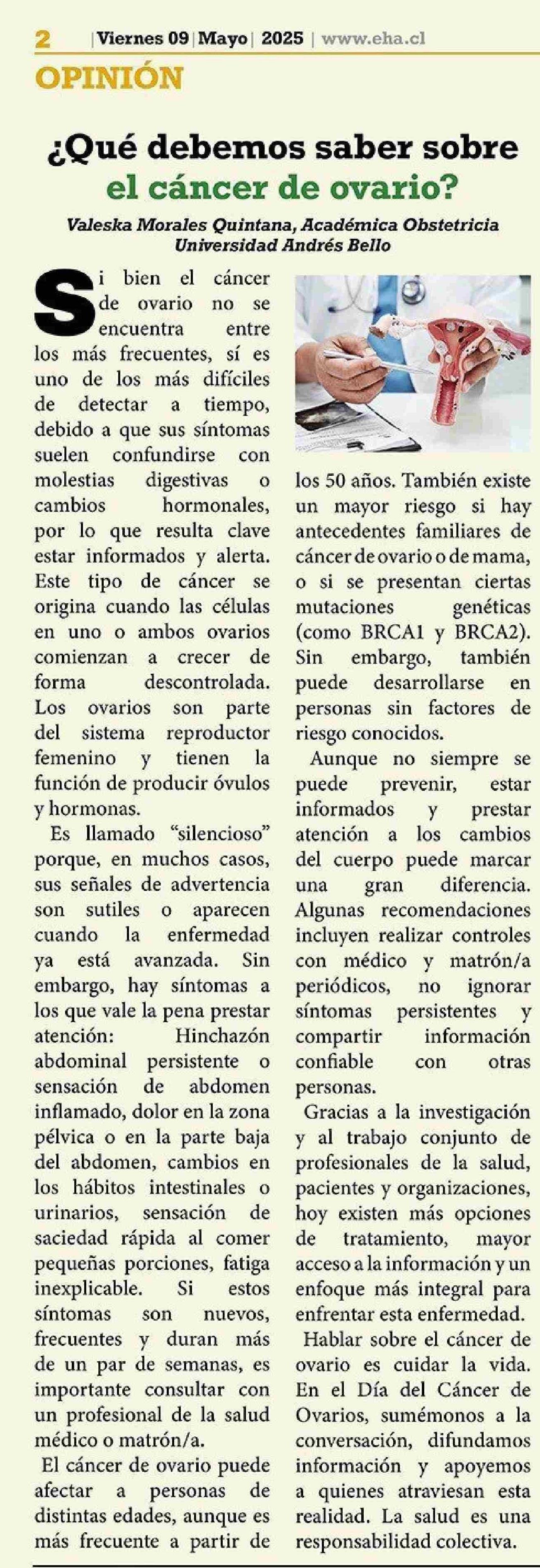COLUMNAS DE OPINIÓN: ¿Qué debemos saber sobre el cáncer de ovario? 09-05-2025 El Heraldo Austral |