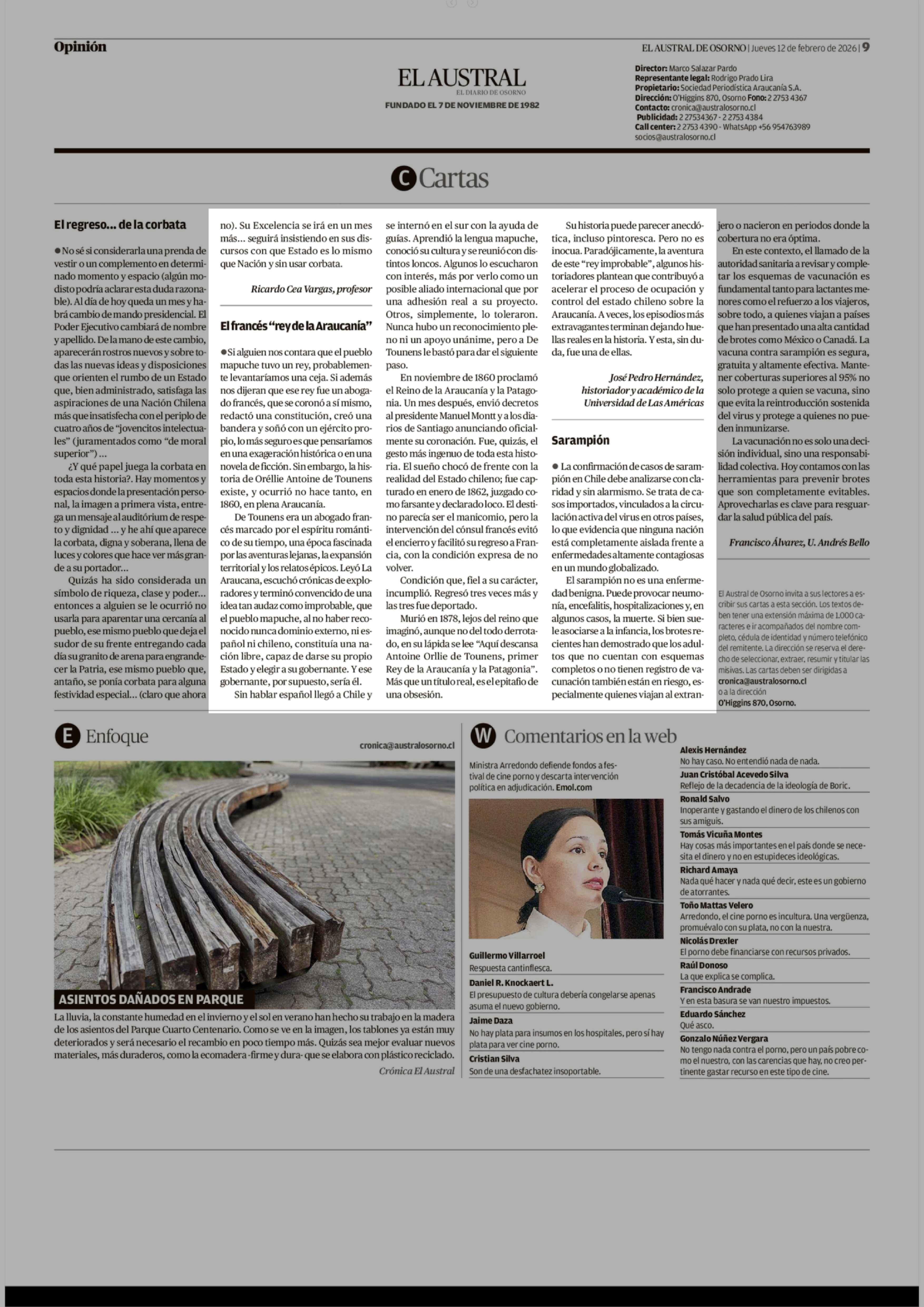 Cartas: El francés "rey de la Araucania" 12-02-2026 El Austral de Osorno |