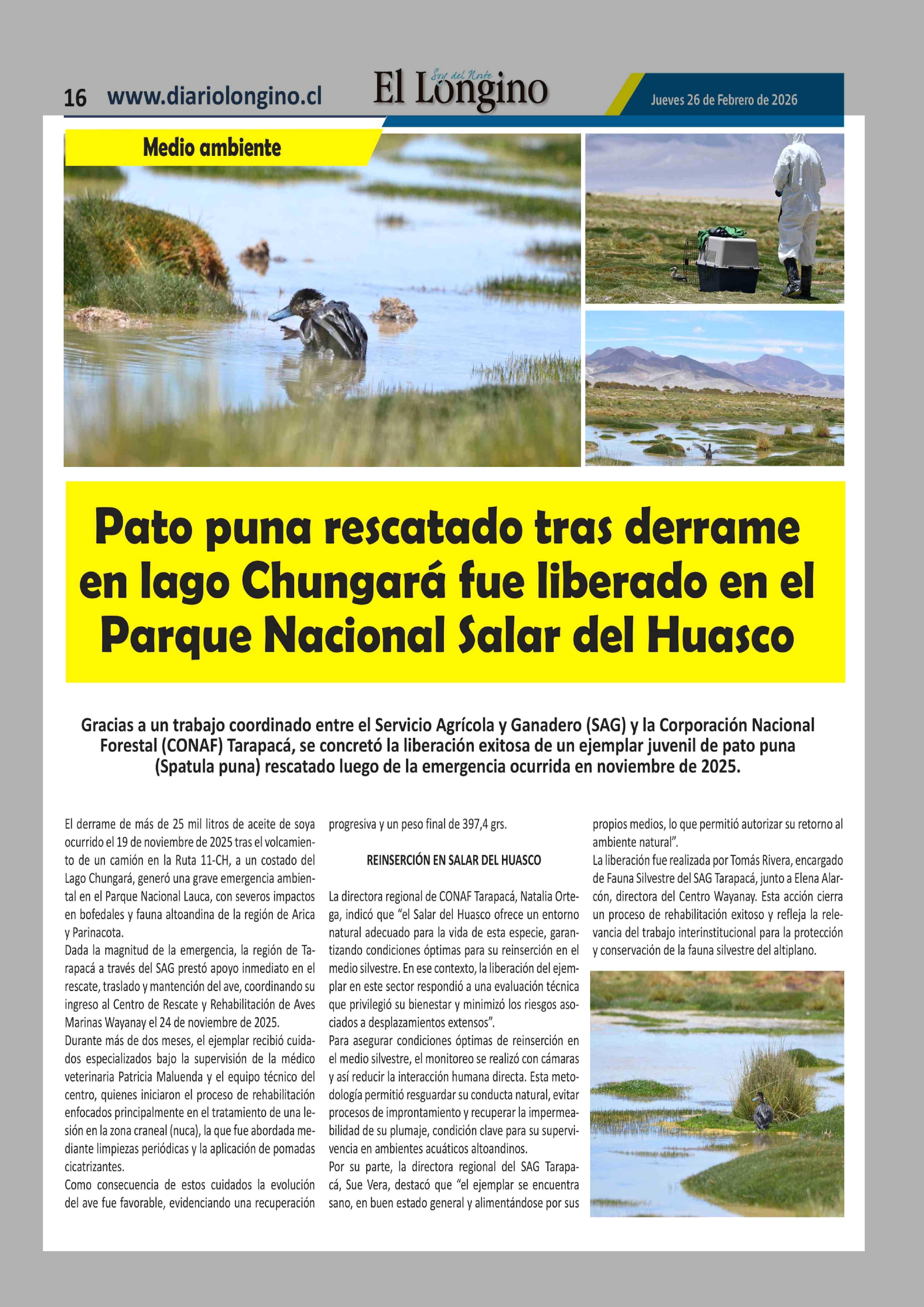 Título: Pato puna rescatado tras derrame en lago Chungará fue liberado en el Parque Nacional Salar del Huasco