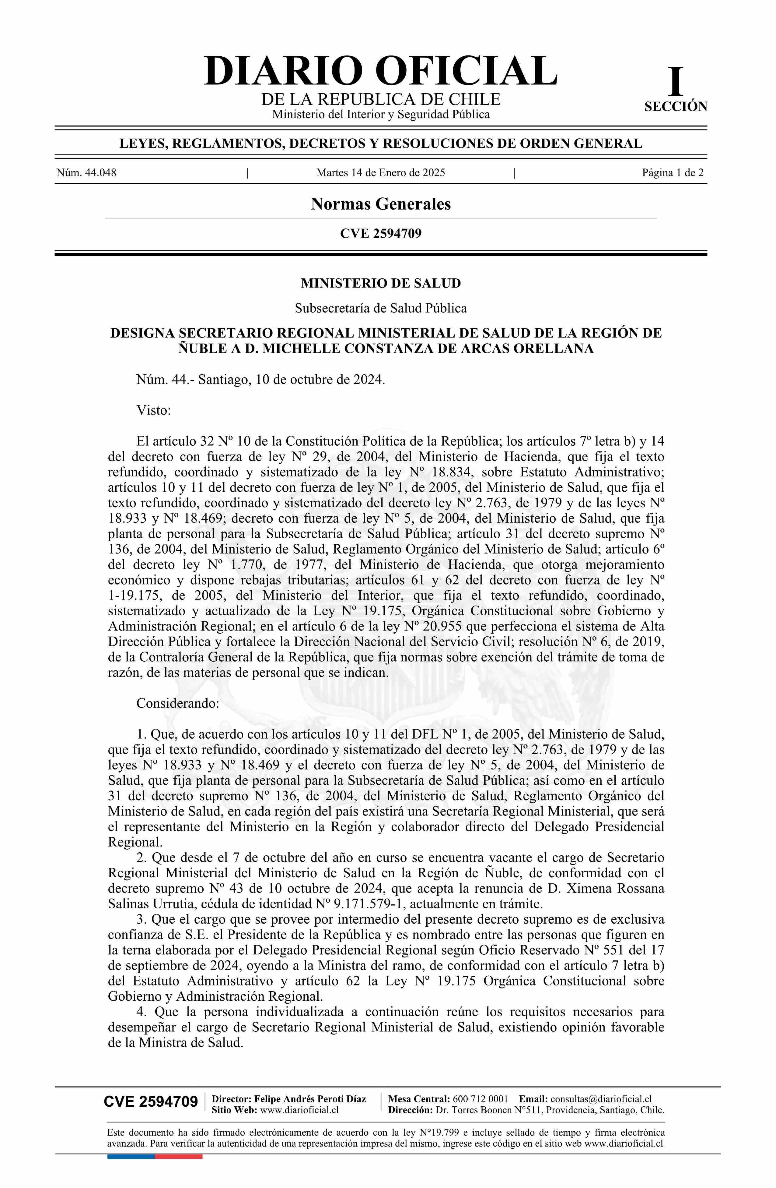 Decreto número 44, de 2024.- Designa a doña Michelle Constanza de Arcas Orellana en el cargo de Secretaria Regional Ministerial de Salud de la Región de Ñuble 14-01-2025 Diario Oficial Edición Electrónica |