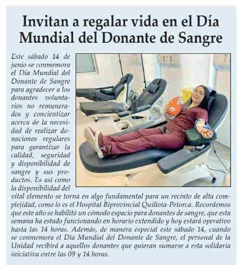 | Título: | Invitan a regalar vida en el Día Mundial del Donante de Sangre |