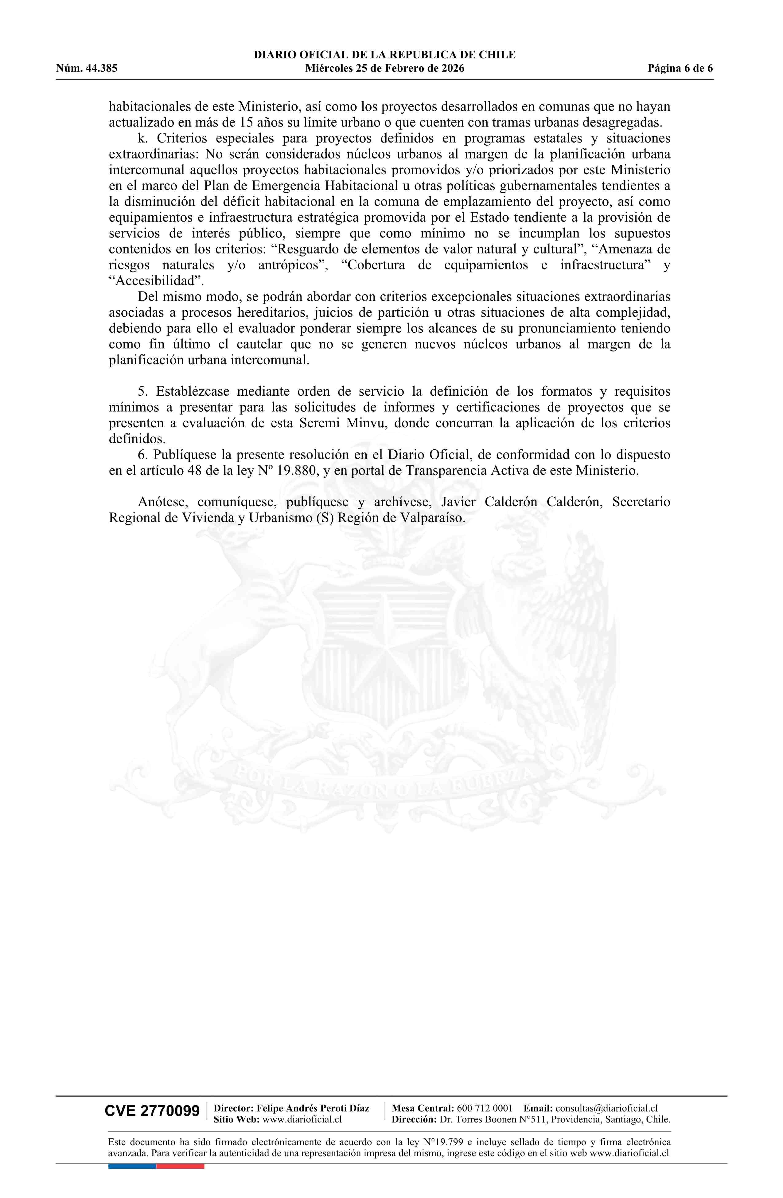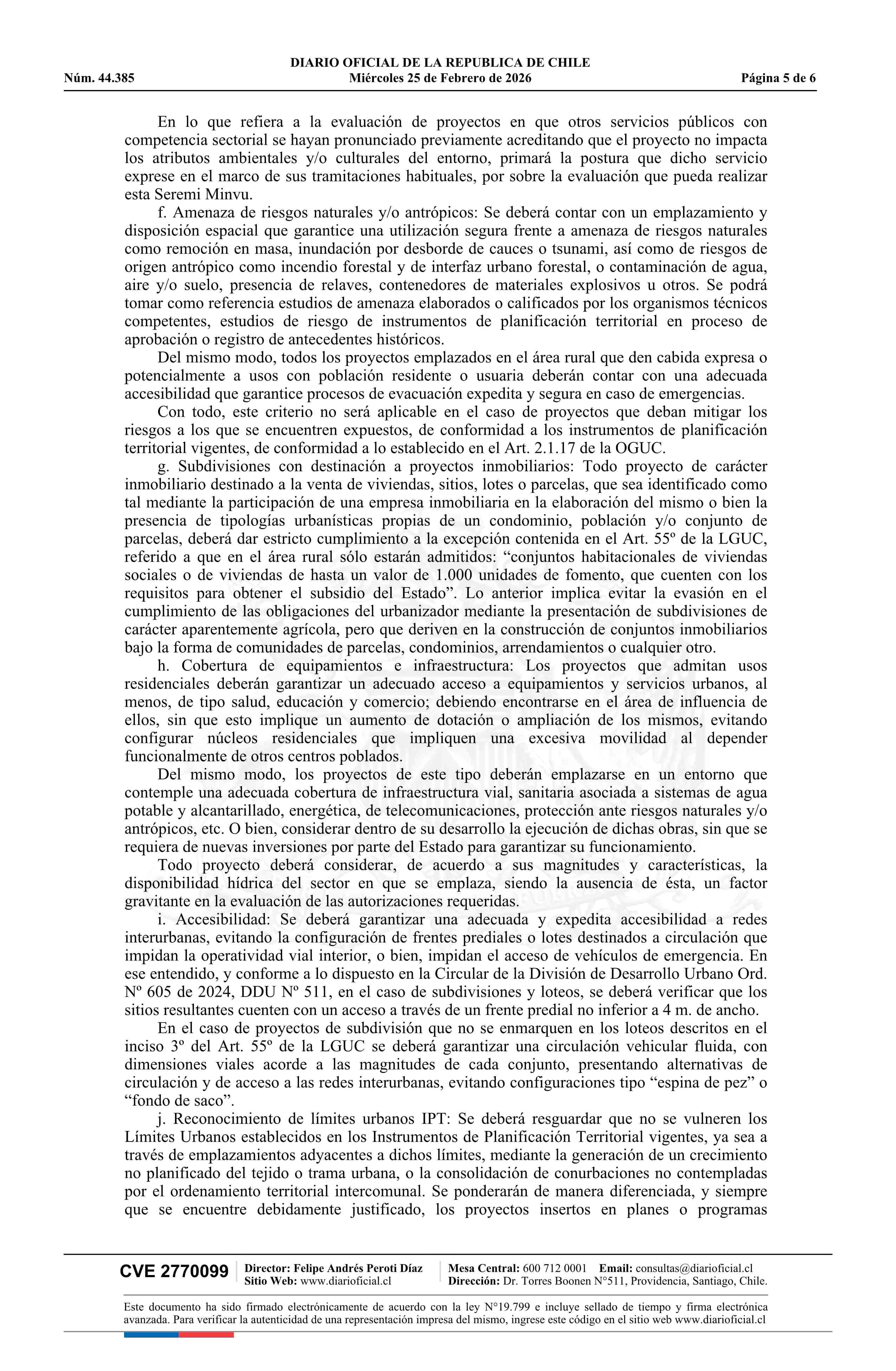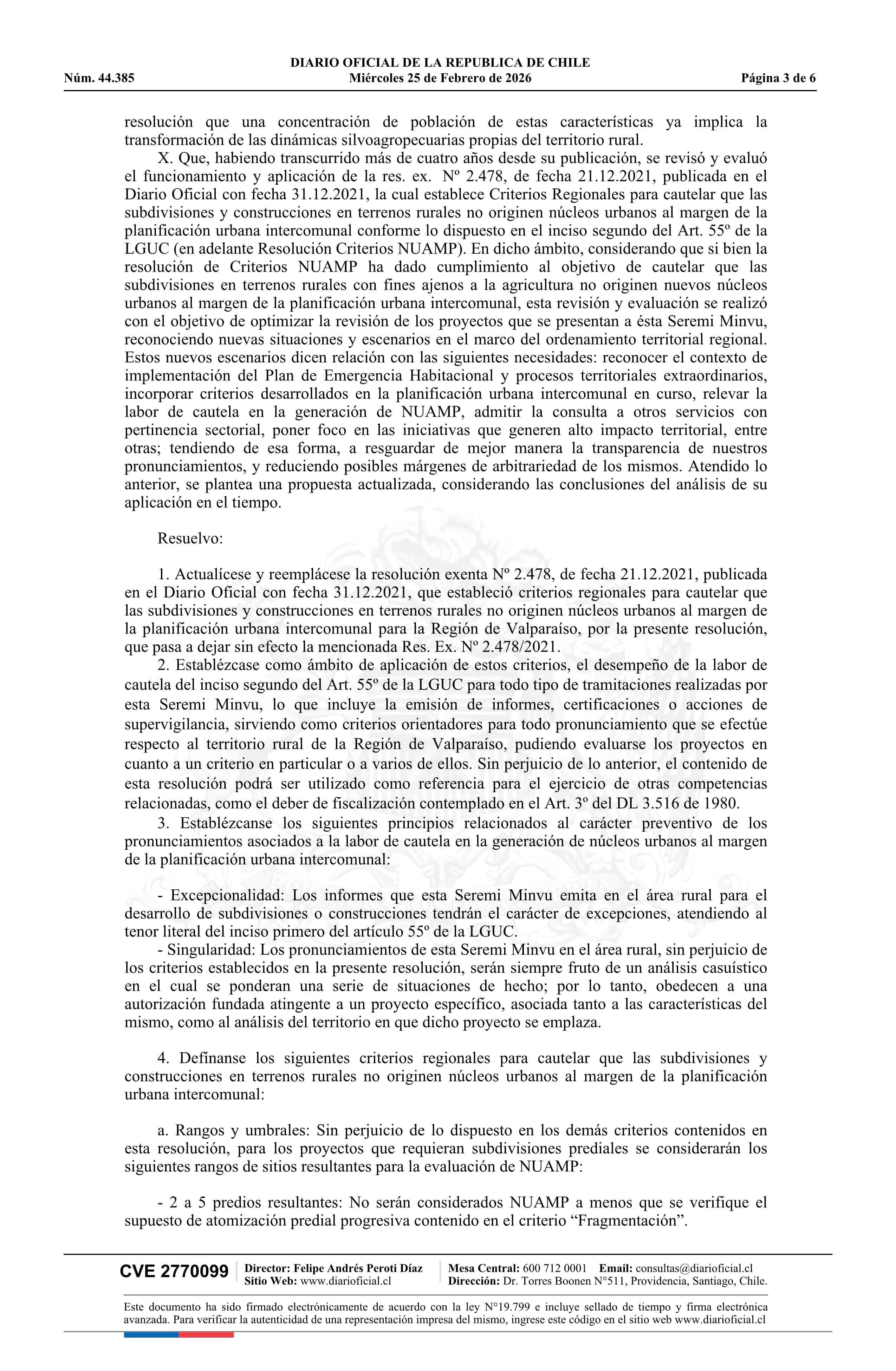 | Título: | Extracto de resolución exenta número 84, de 2026.- Actualiza criterios regionales para cautelar que las subdivisiones y construcciones en terrenos rurales con fines ajenos a la agricultura no originen nuevos núcleos urbanos al margen de la planificación urbana intercomunal, conforme lo dispuesto en |