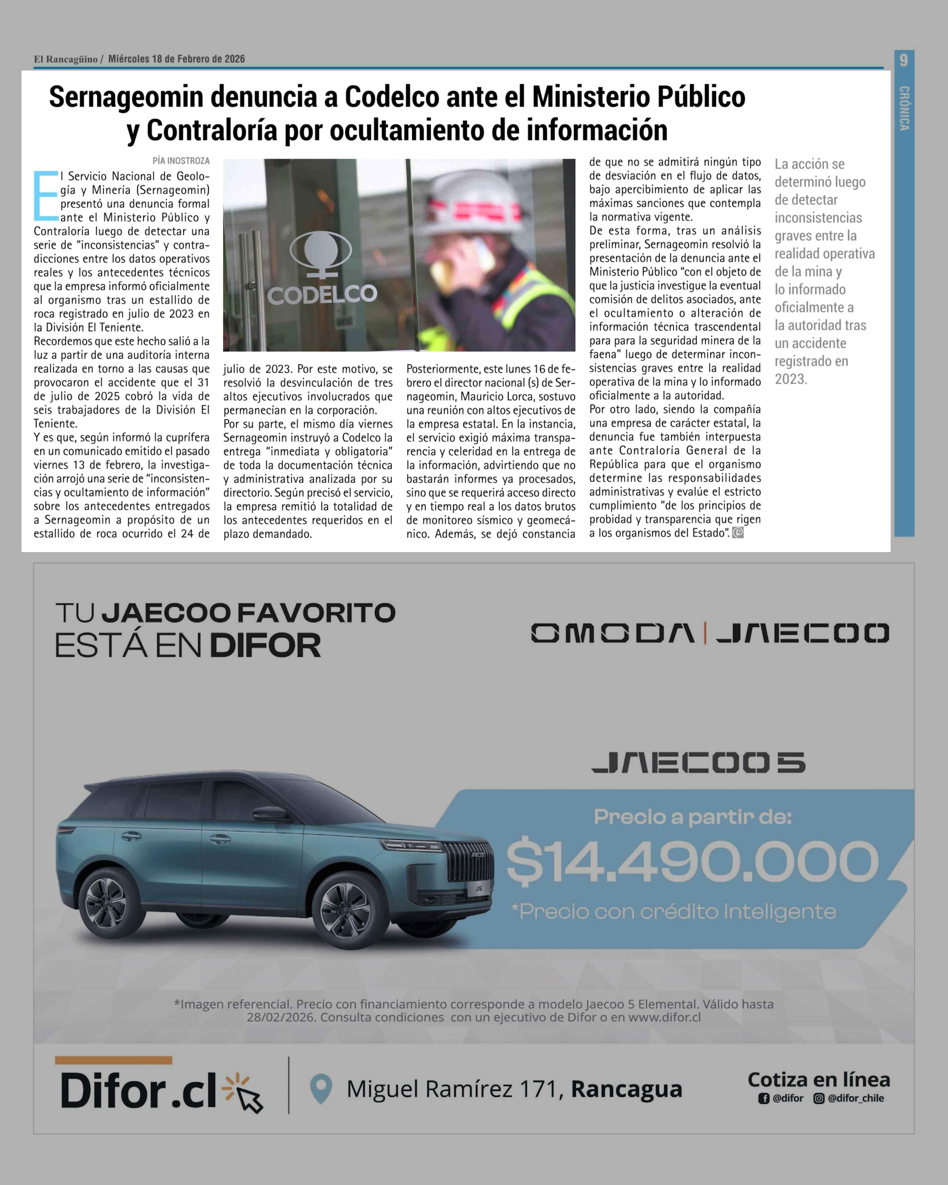 Sernageomin denuncia a Codelco ante el Ministerio Público y Contraloría por ocultamiento de información 18-02-2026 El Rancagüino |