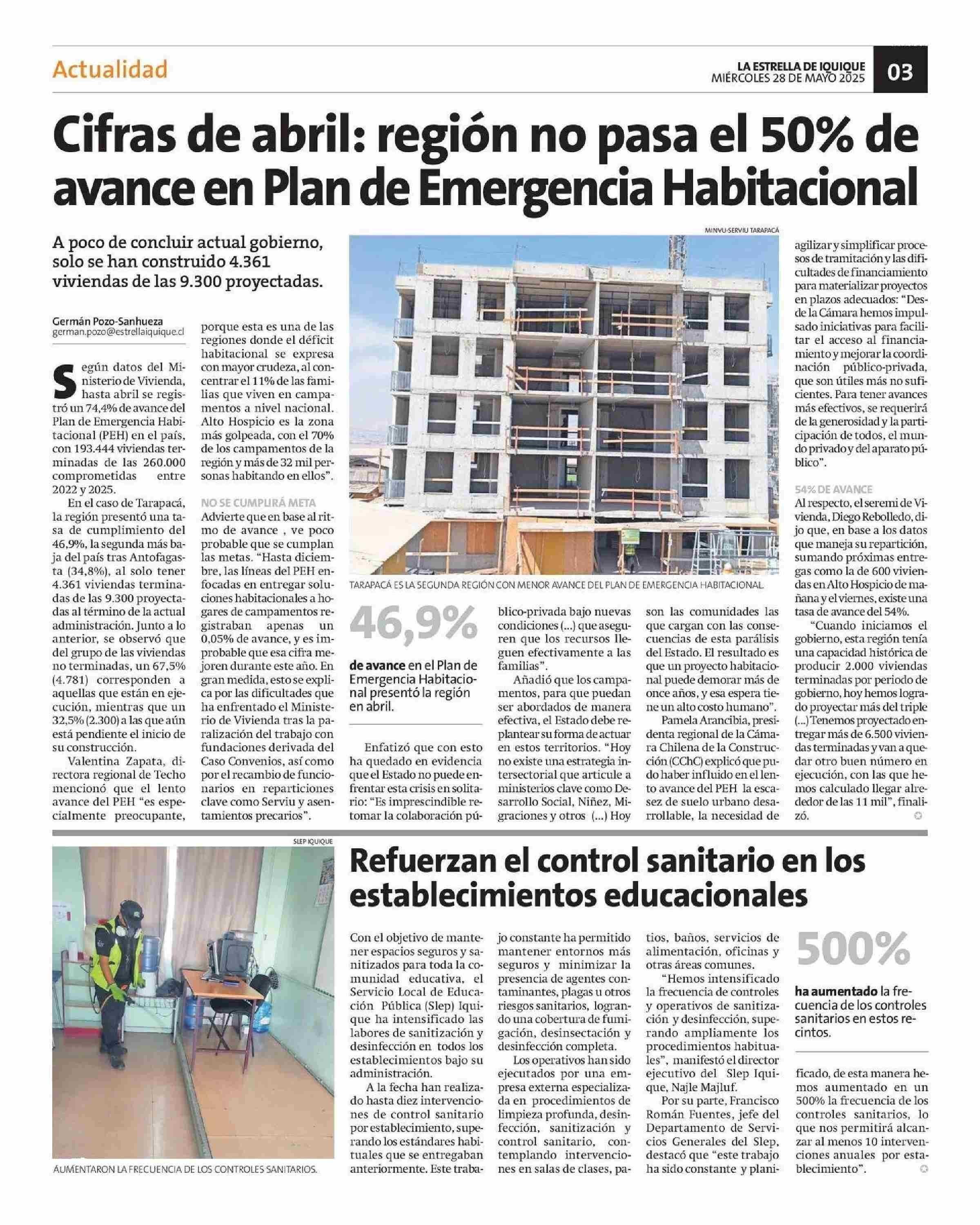 Cifras de abril: región no pasa el 50% de avance en Plan de Emergencia Habitacional 28-05-2025 La Estrella de Iquique |