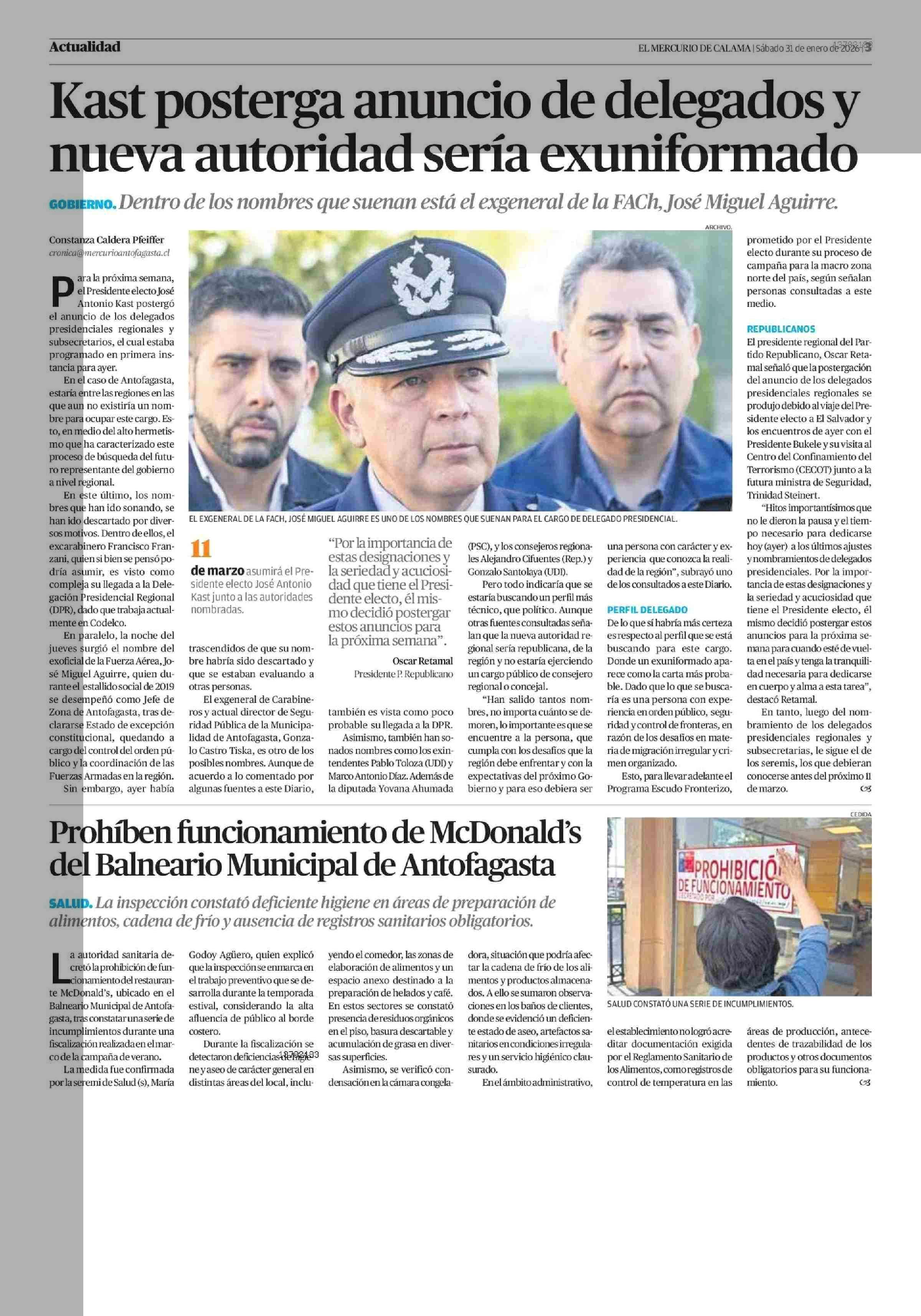 Kast posterga anuncio de delegados y nueva autoridad sería exuniformado 31-01-2026 El Mercurio de Calama |