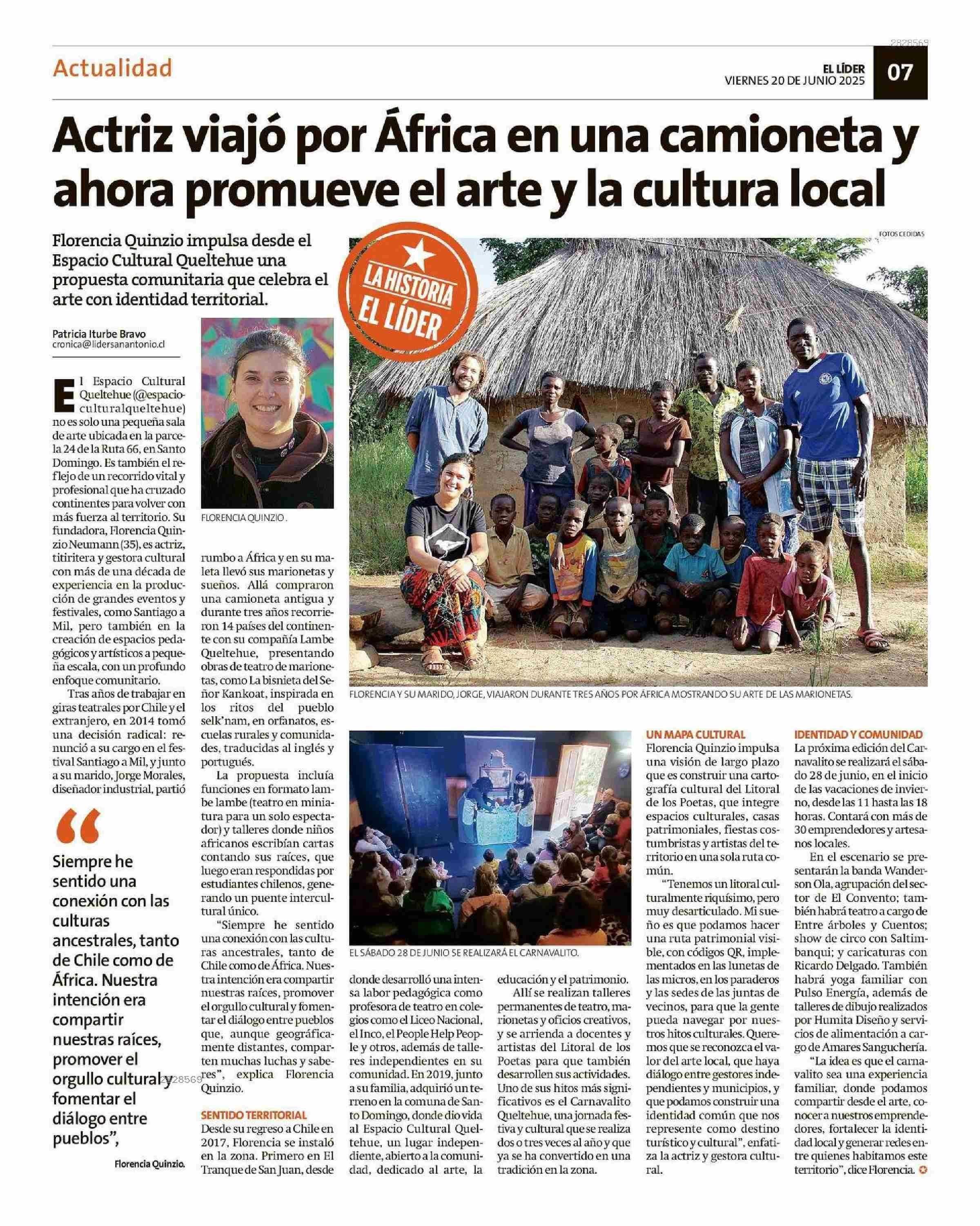 Actriz viajó por África en una camioneta y ahora promueve el arte y la cultura local 20-06-2025 El Líder |
