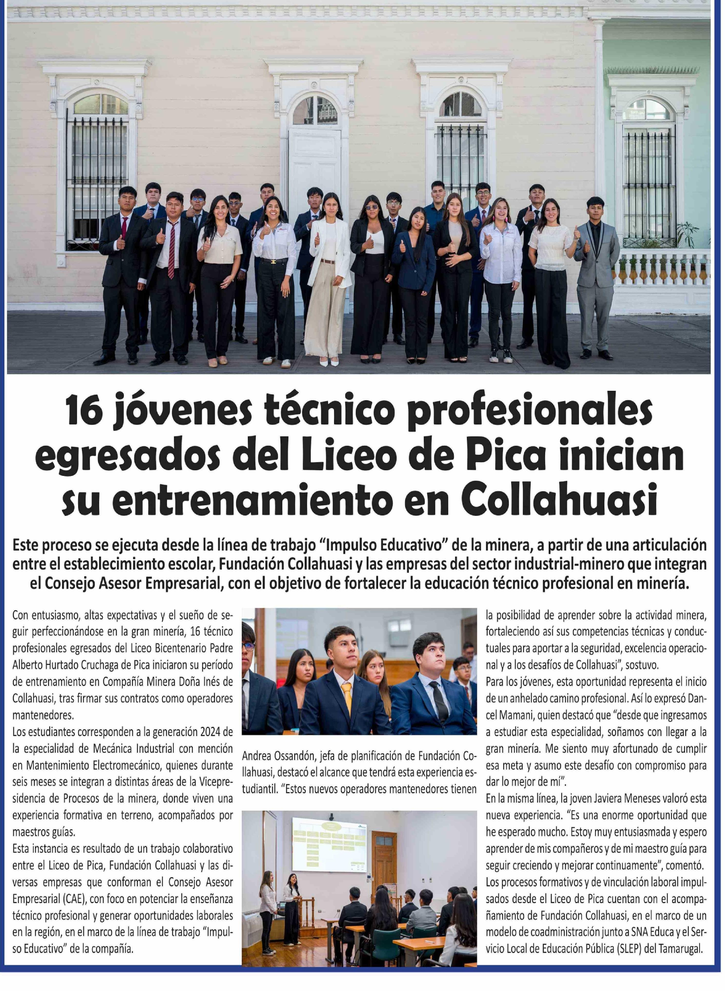 16 Jóvenes técnico profesionales egresados del Liceo de Pica inician su entrenamiento en Collahuasi 22-04-2026 El Longino |