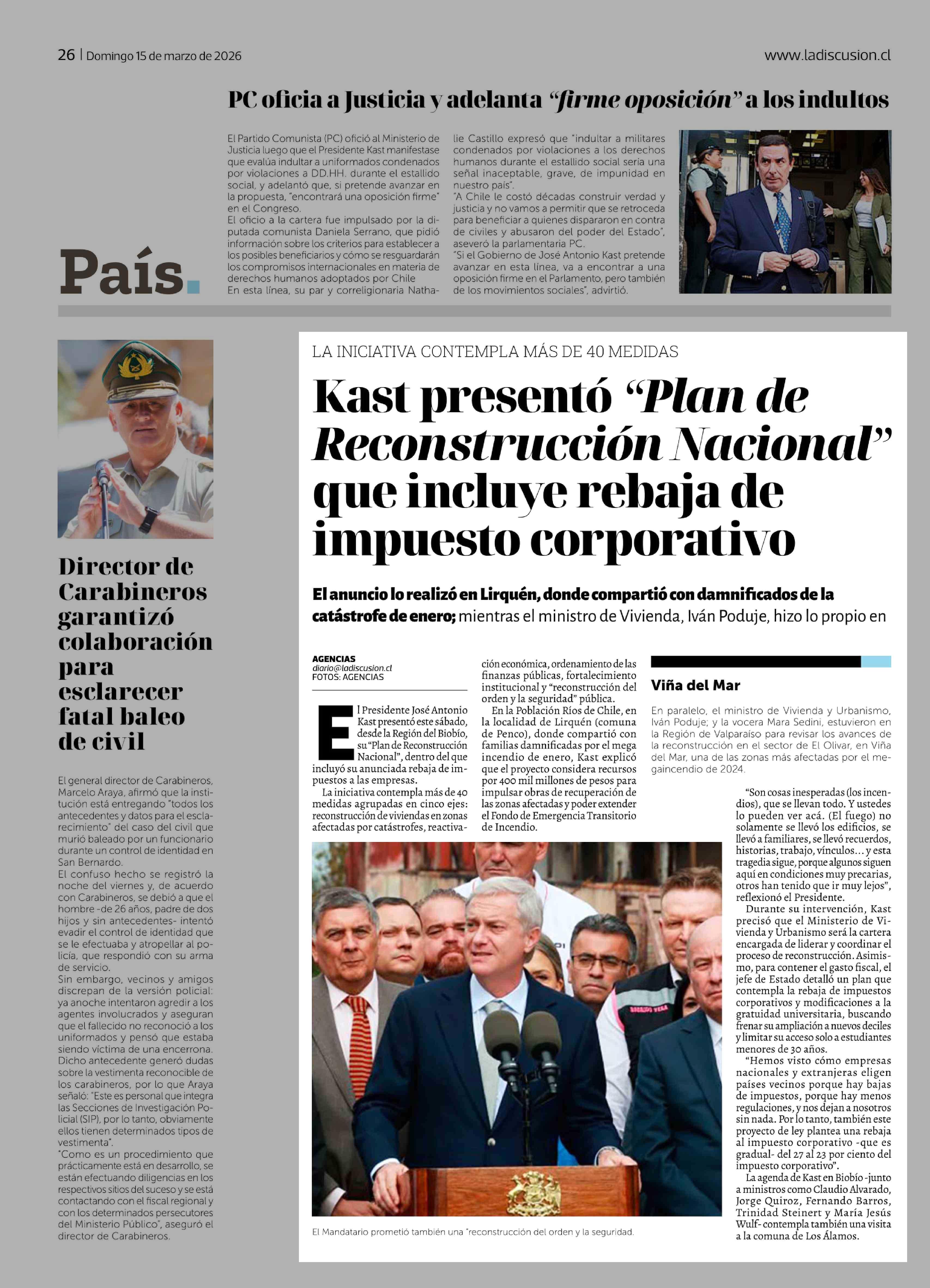 Kast presentó "Plan de Reconstrucción Nacional" que incluye rebaja de impuesto corporativo 15-03-2026 La Discusión |