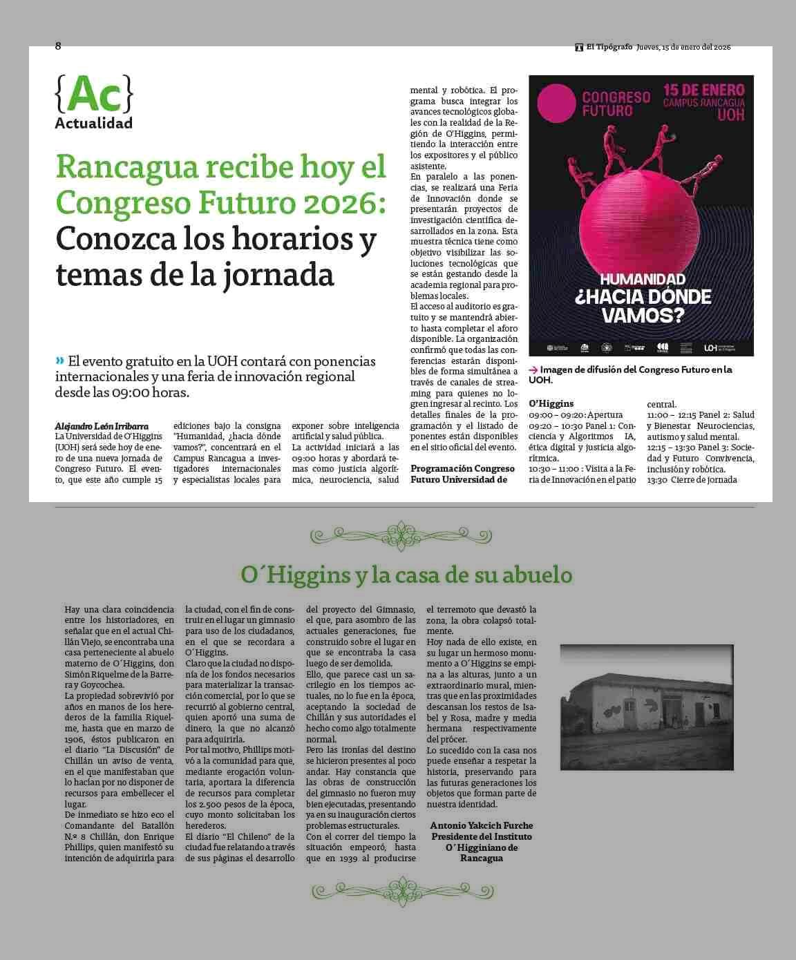 Título: Rancagua recibe hoy el Congreso Futuro 2026: Conozca los horarios y temas de la jornada