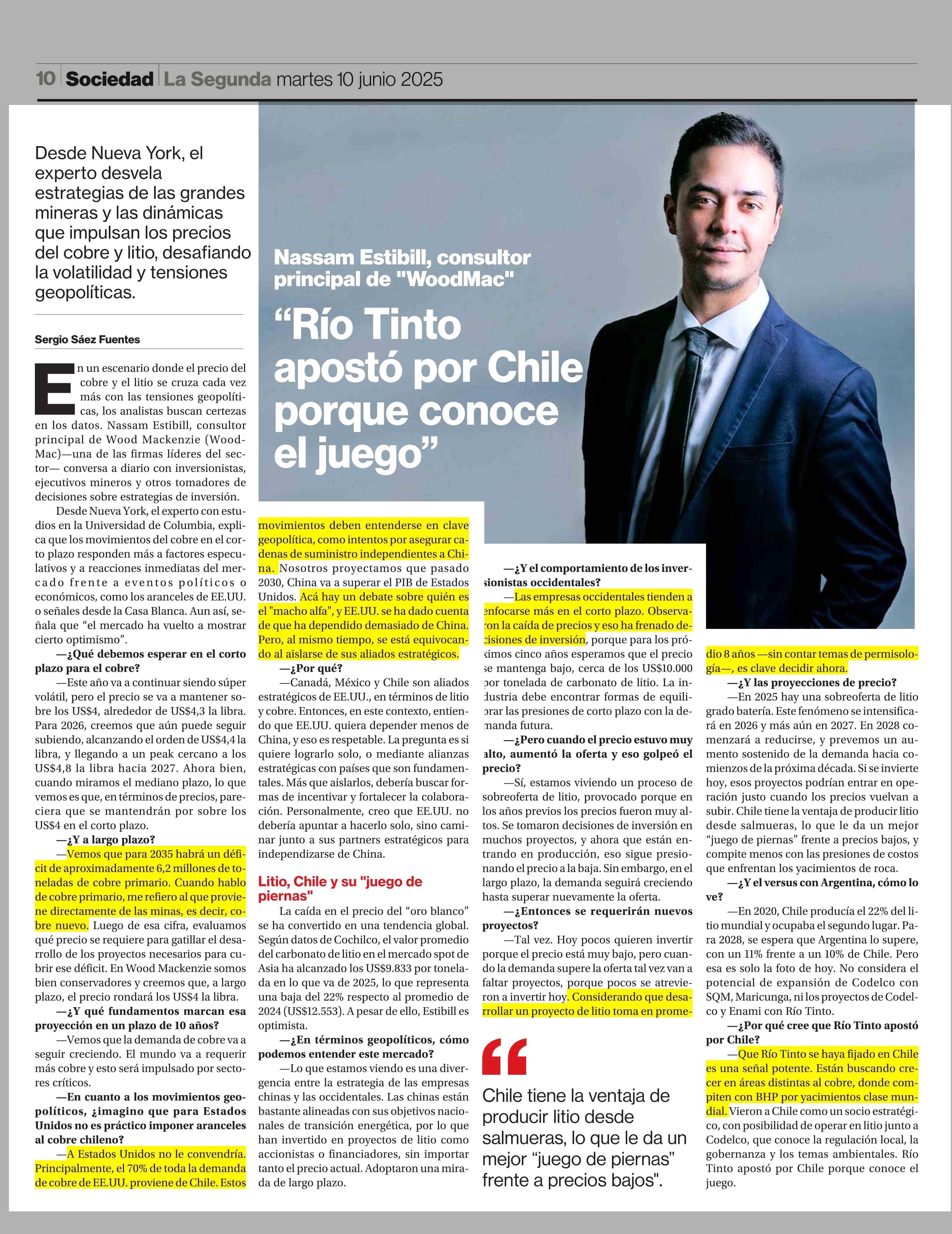 "Río Tinto apostó por Chile porque conoce el juego" 10-06-2025 La Segunda |