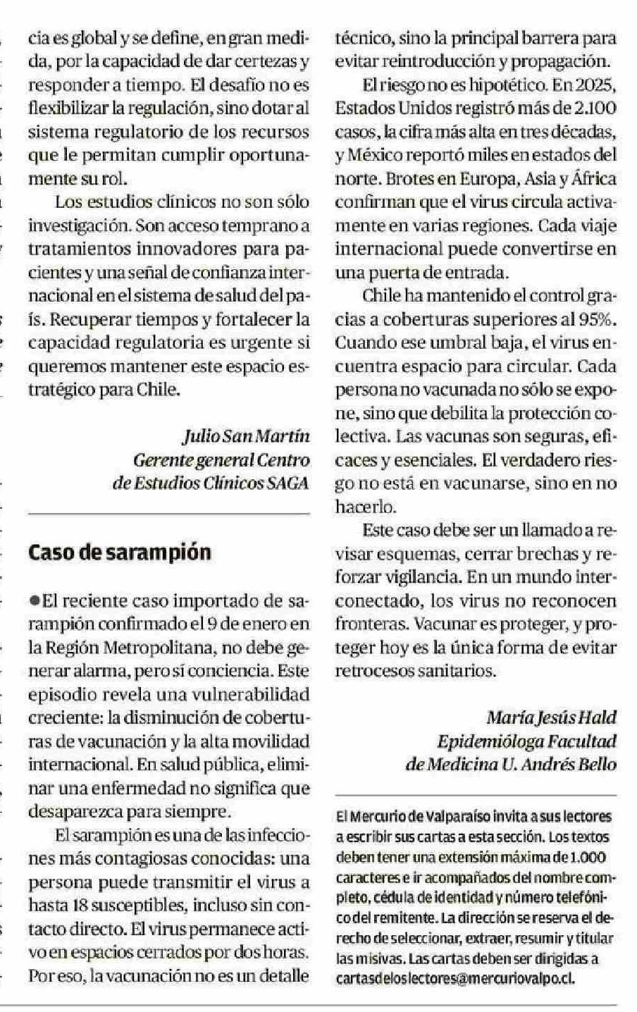 CARTA: Caso de sarampión 16-01-2026 El Mercurio de Valparaíso |
