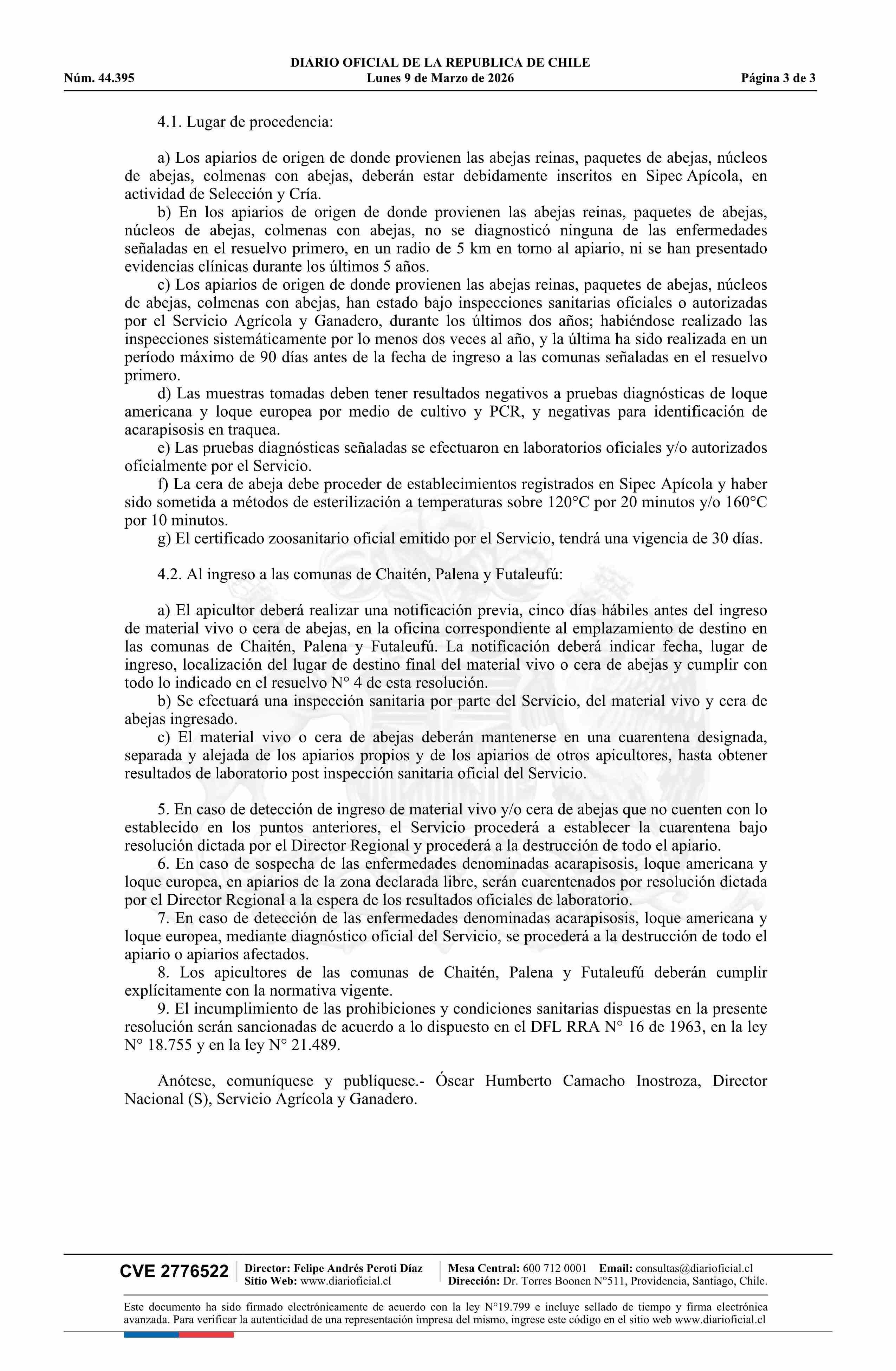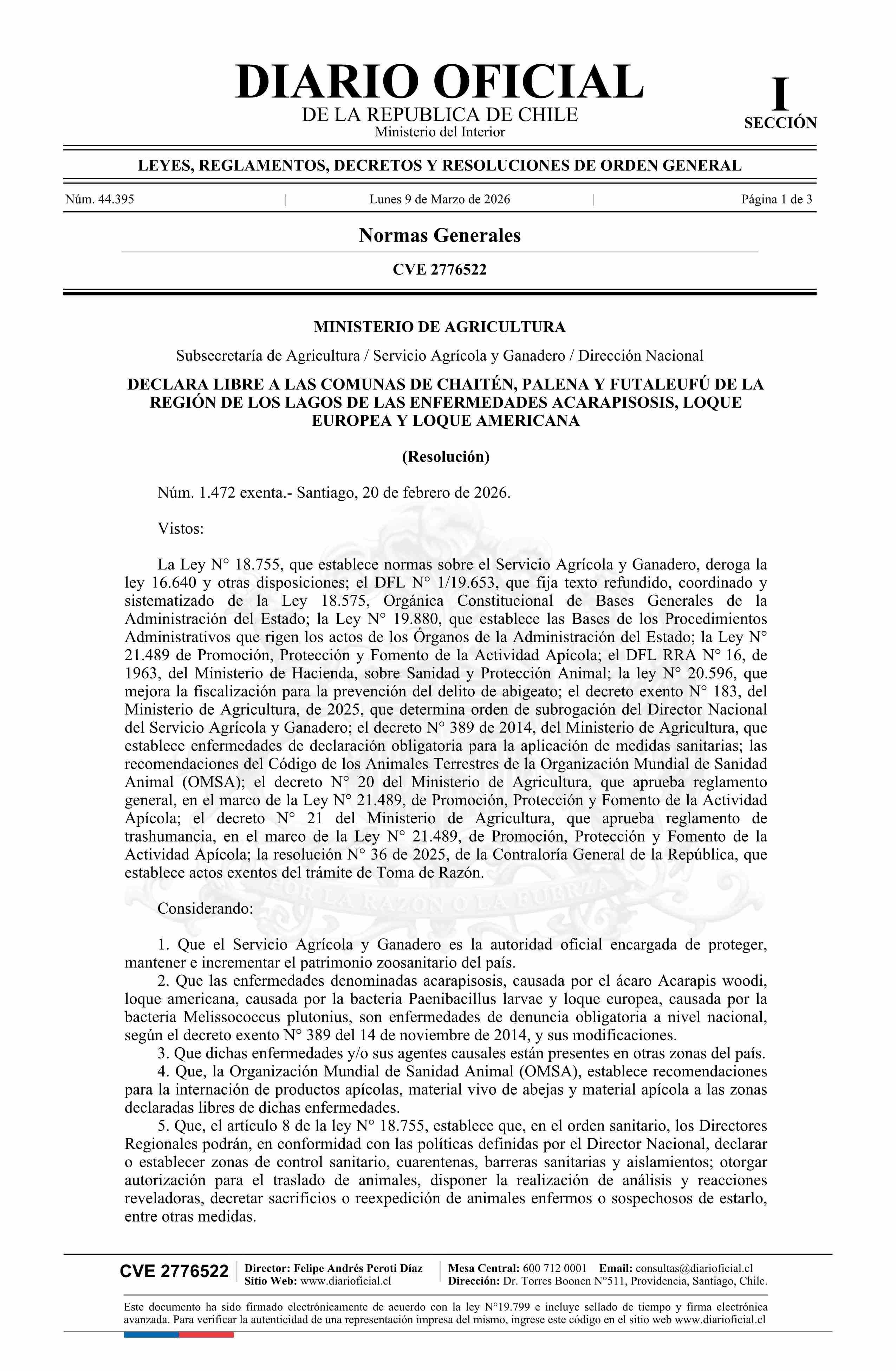 | Título: | Resolución exenta número 1.472, de 2026.- Declara libres a las comunas de Chaitén, Palena y Futaleufú de la Región de Los Lagos de las enfermedades Acarapisosis, Loque europea y Loque americana |