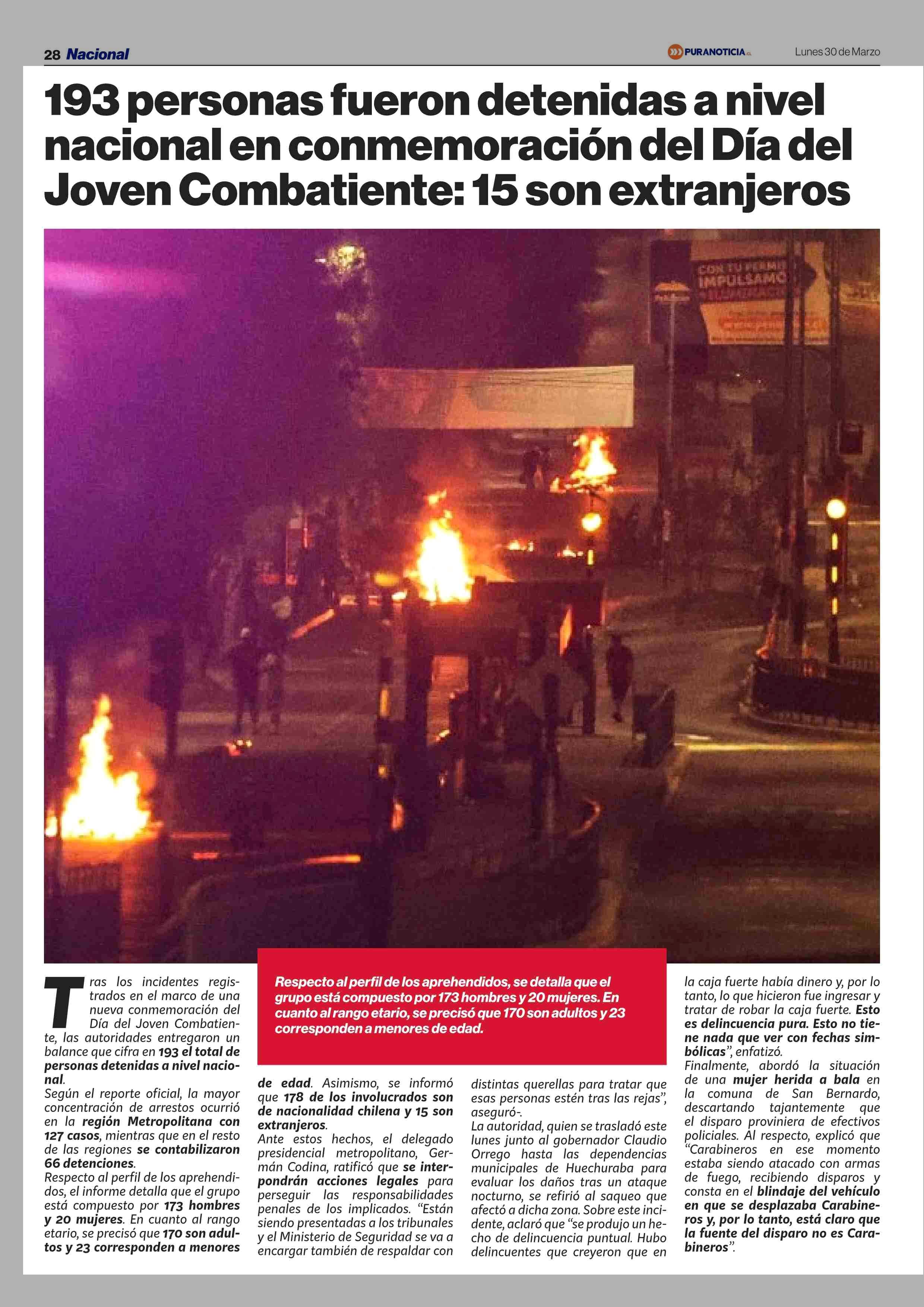 193 personas fueron detenidas a nivel nacional en conmemoración del Día del Joven Combatiente: 15 son extranjeros 30-03-2026 Puranoticia.cl |