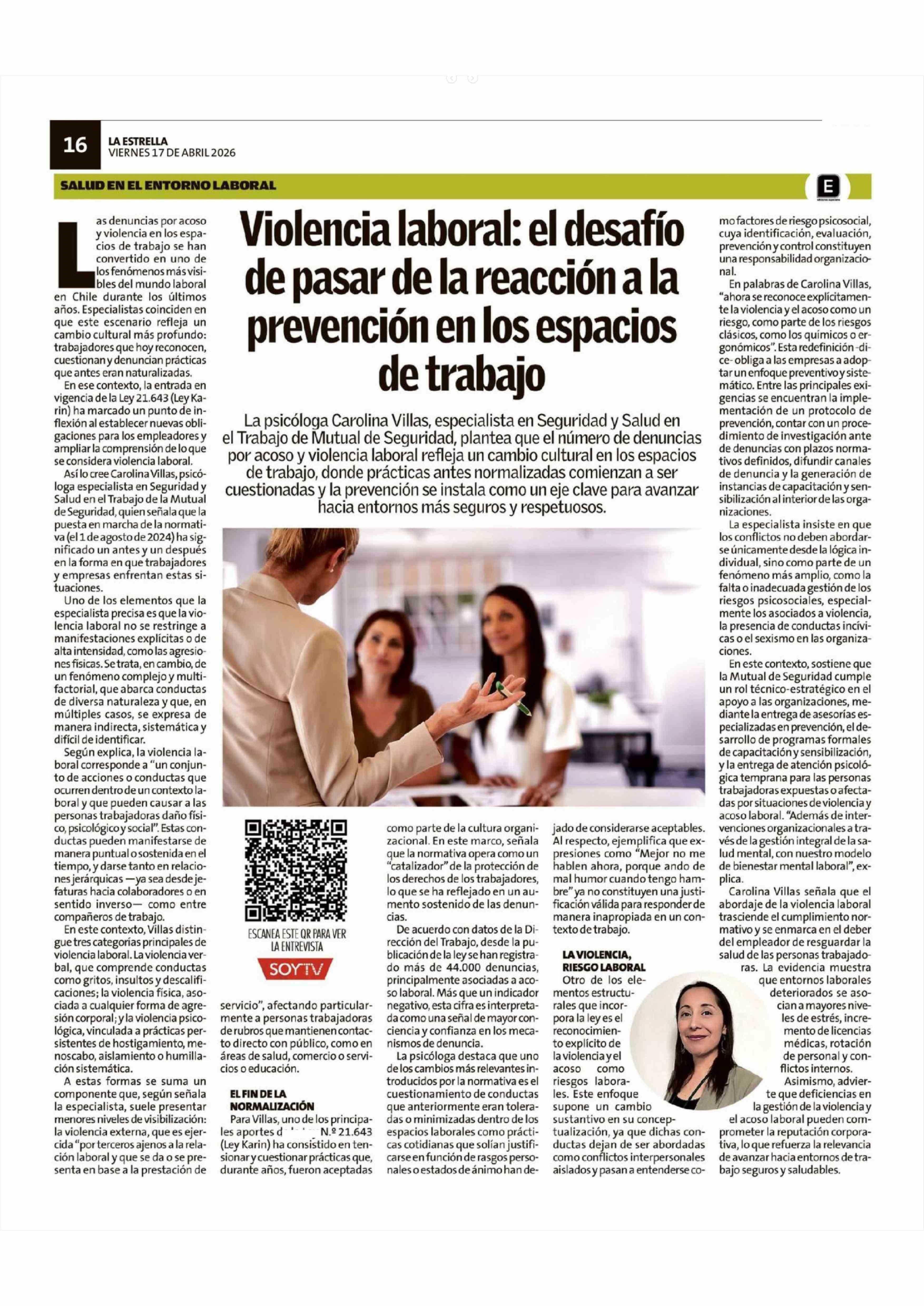 Violencia laboral: el desafío de pasar de la reacción a la prevención en los espacios de trabajo 17-04-2026 La Estrella de Chiloé |