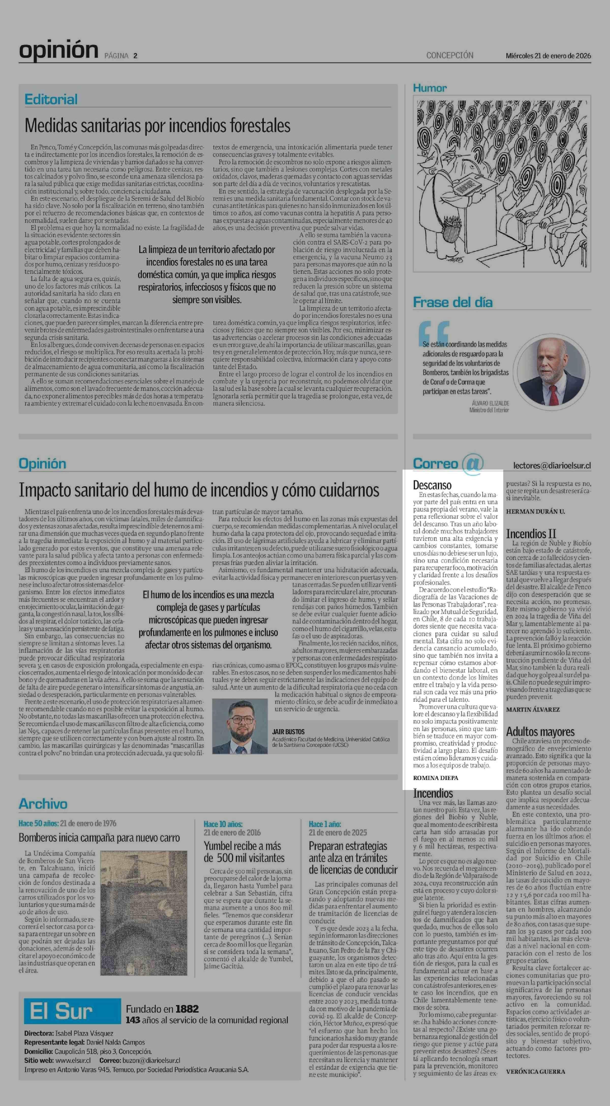 Título: Cartas: Descanso En estas fechas, cuando la mayor parte del país entra en una pausa propia del verano, vale la pena reflexionar sobre el valor del descanso. Tras un año laboral donde muchos trabajadores tuvieron una alta exigencia y cambios constantes, tomarse unos días no debiese ser un lujo, sino