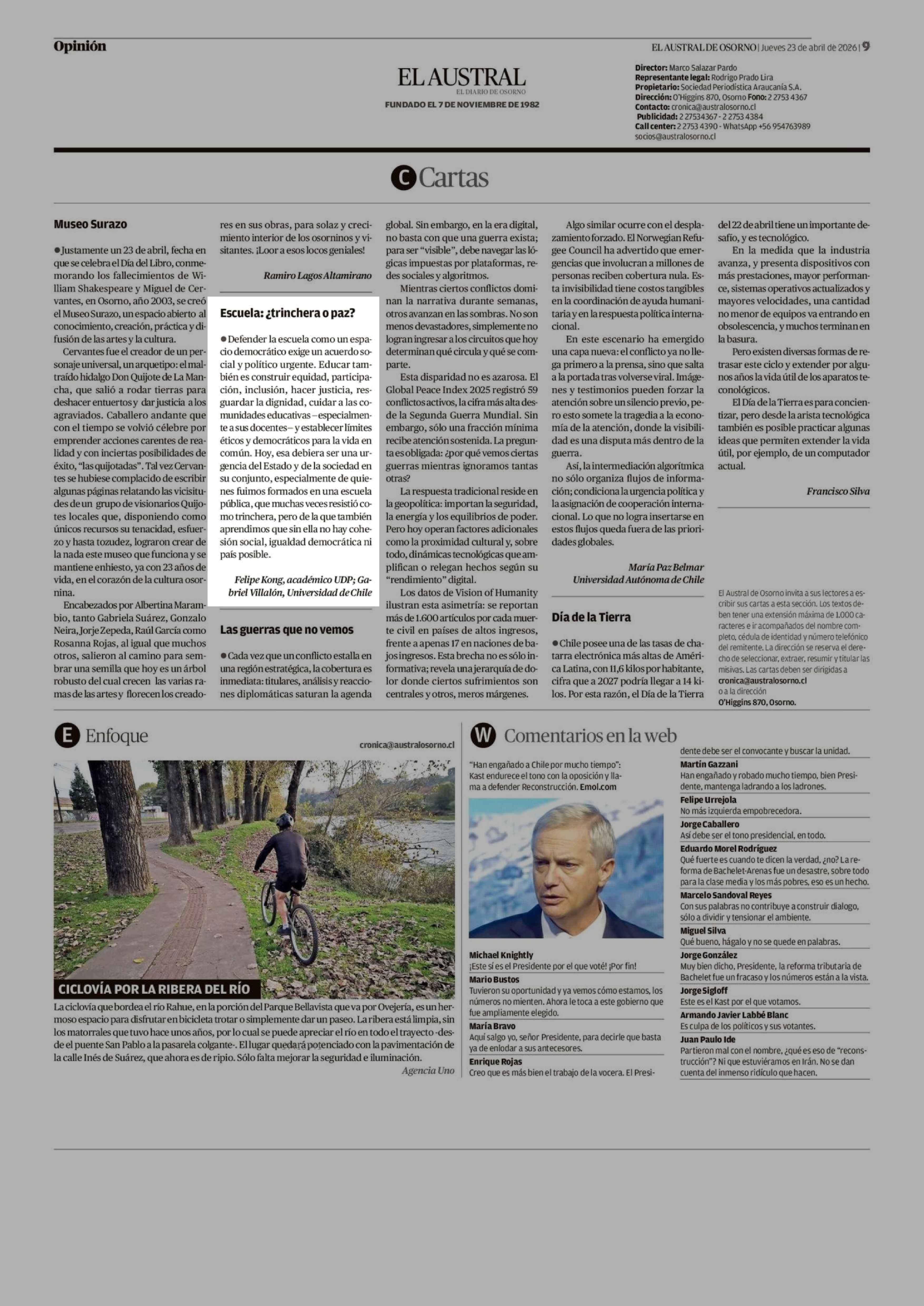 Cartas: Escuela: ¿ trinchera o paz? 23-04-2026 El Austral de Osorno |