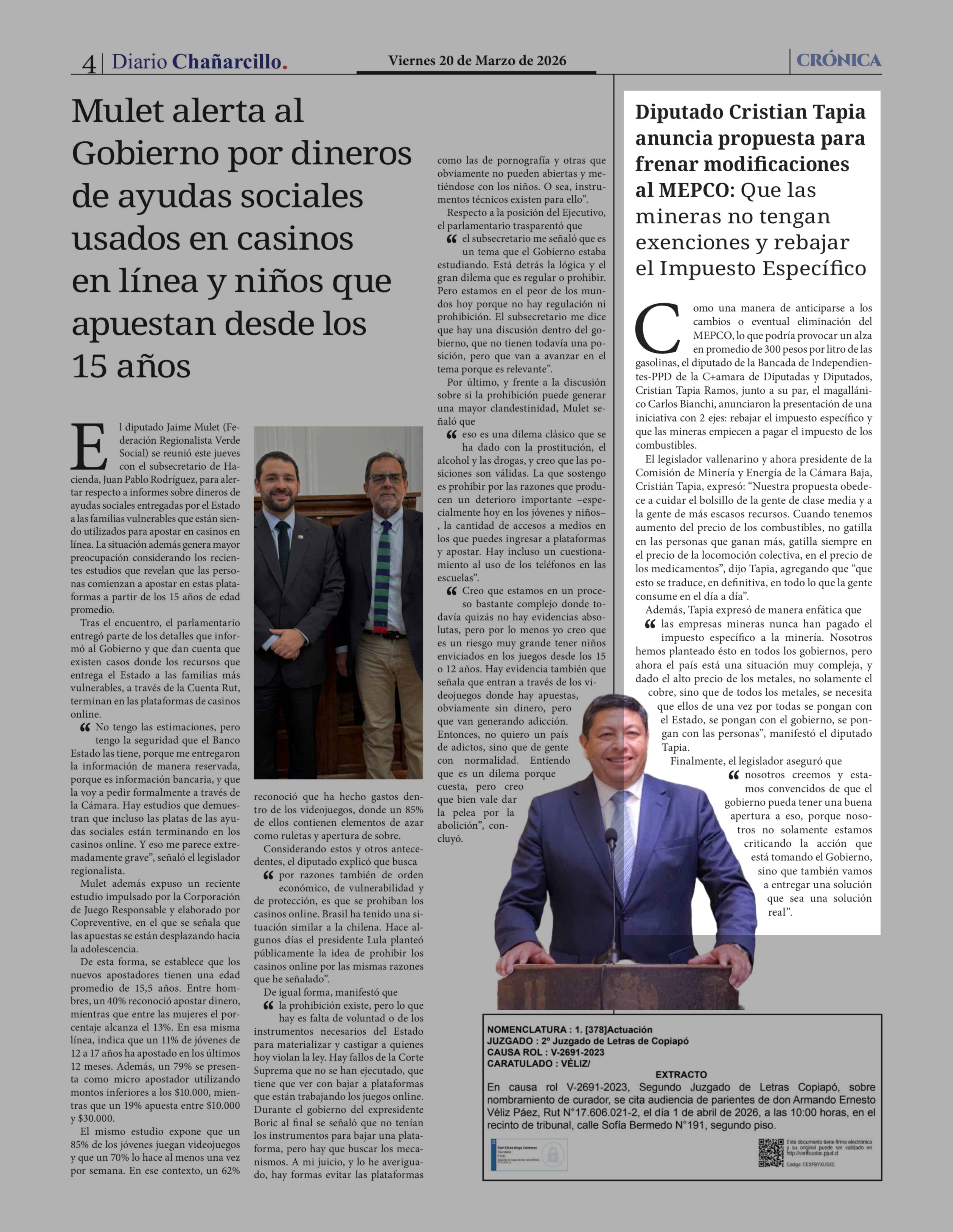 Diputado Cristian Tapia anuncia propuesta para frenar modificaciones al MEPCO: Que las mineras no tengan exenciones y rebajar el Impuesto Específico 20-03-2026 Diario Chañarcillo |