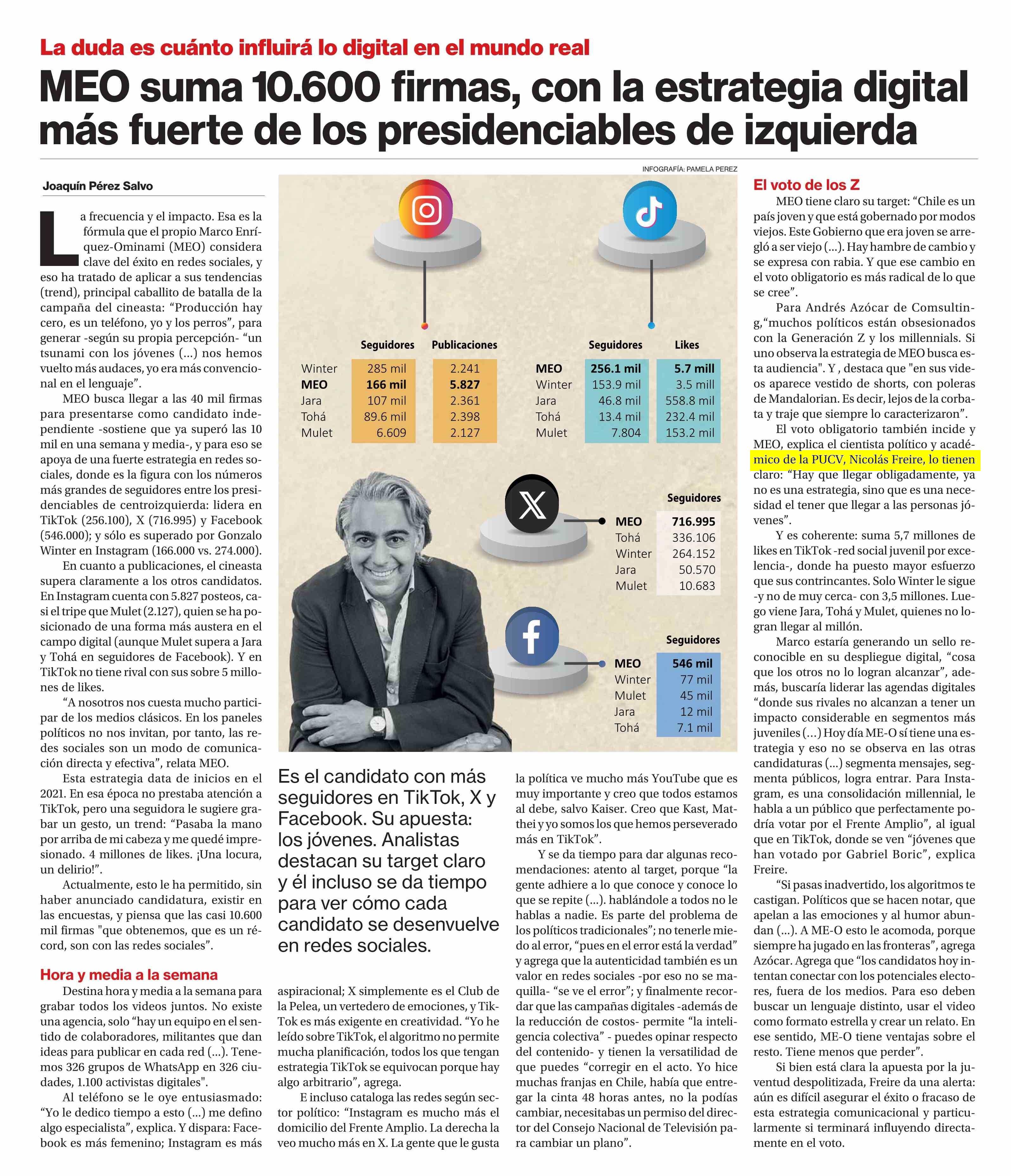 MEO suma 10.600 firmas, con la estrategia digital más fuerte de los presidenciables de izquierda 02-06-2025 La Segunda |