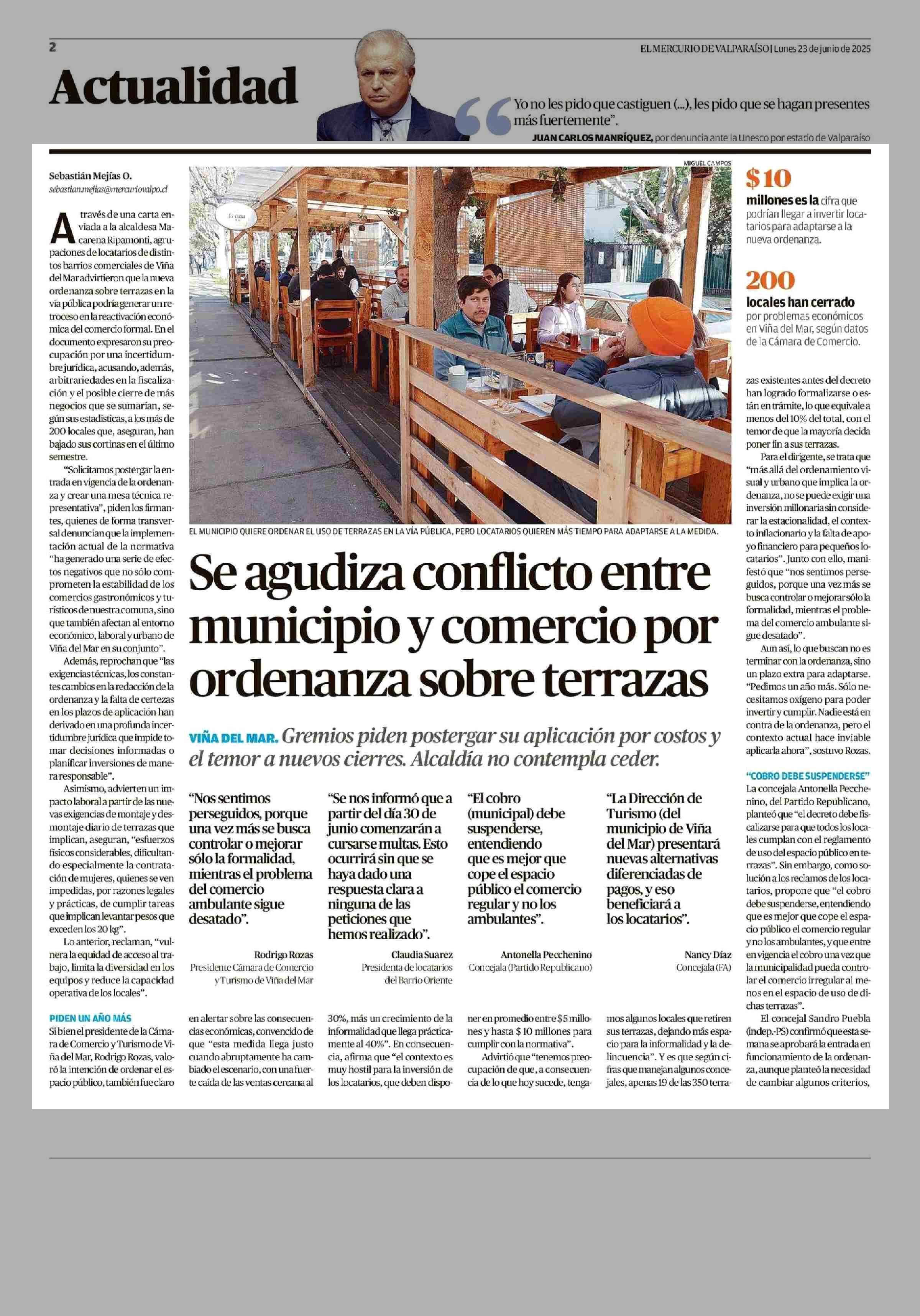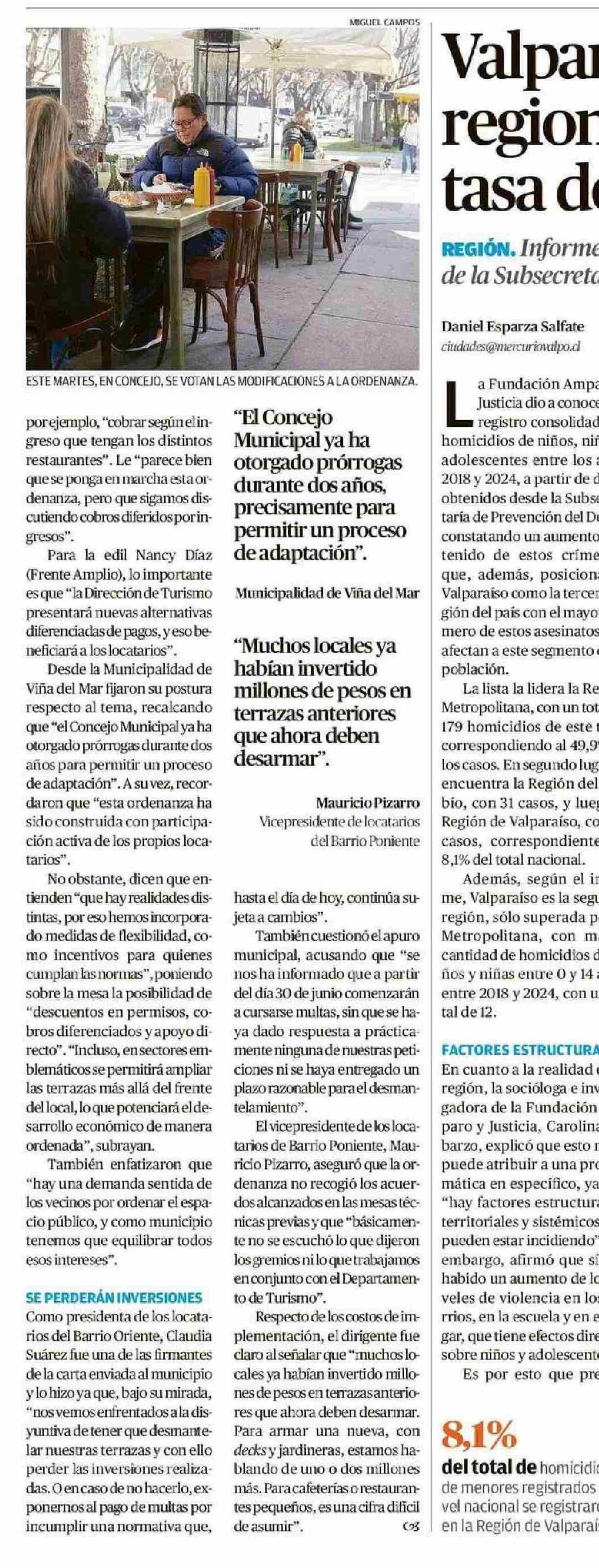 Se agudiza conflicto entre municipio y comercio por ordenanza sobre terrazas 23-06-2025 El Mercurio de Valparaíso |