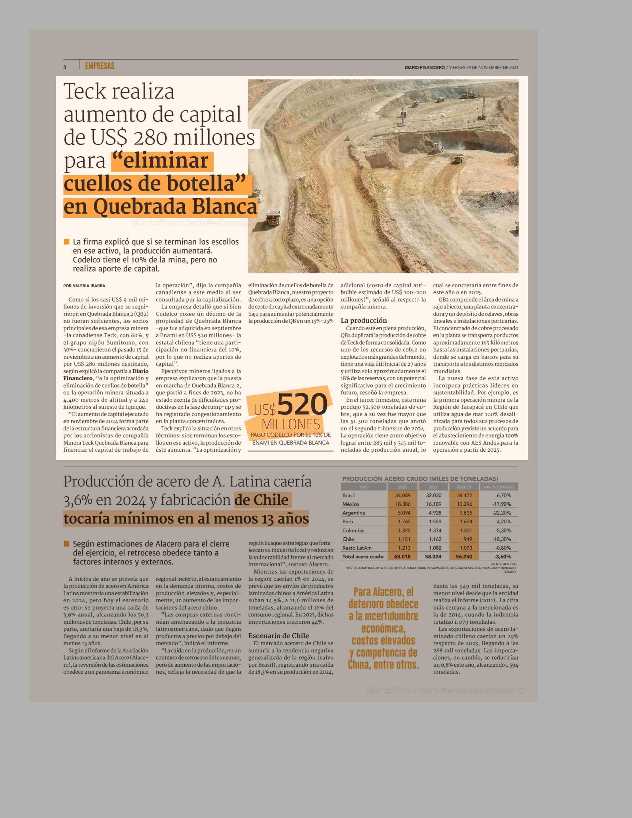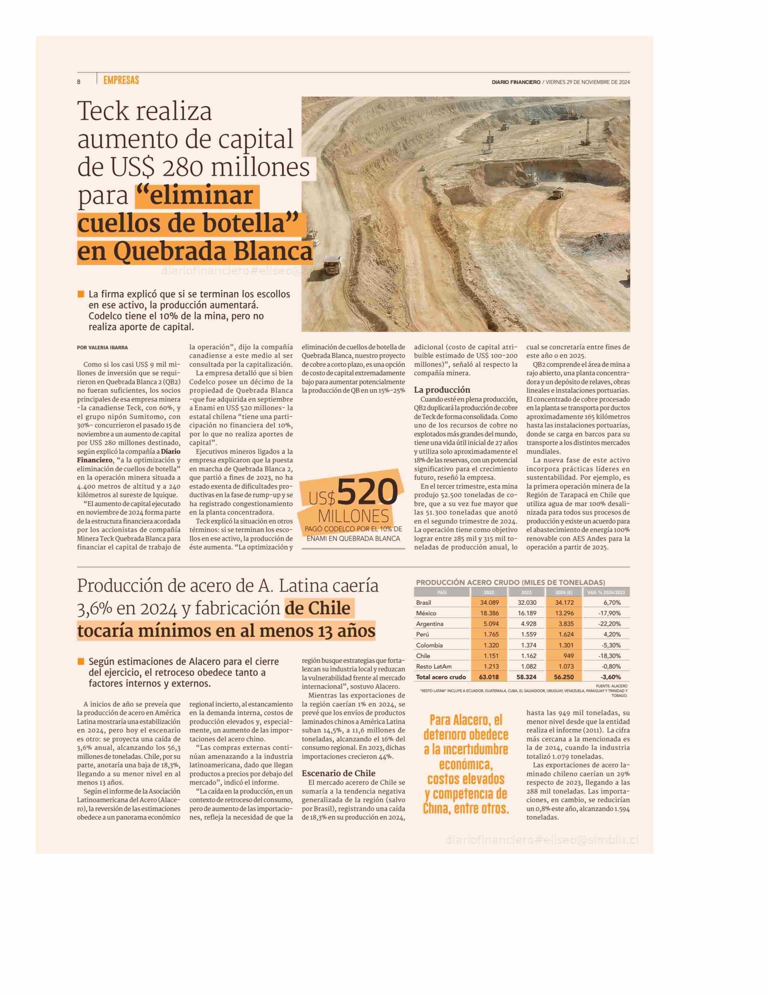 Teck realiza aumento de capital de US$ 280 millones para ´´eliminar cuellos de botella'' en Quebrada Blanca 29-11-2024 Diario Financiero |