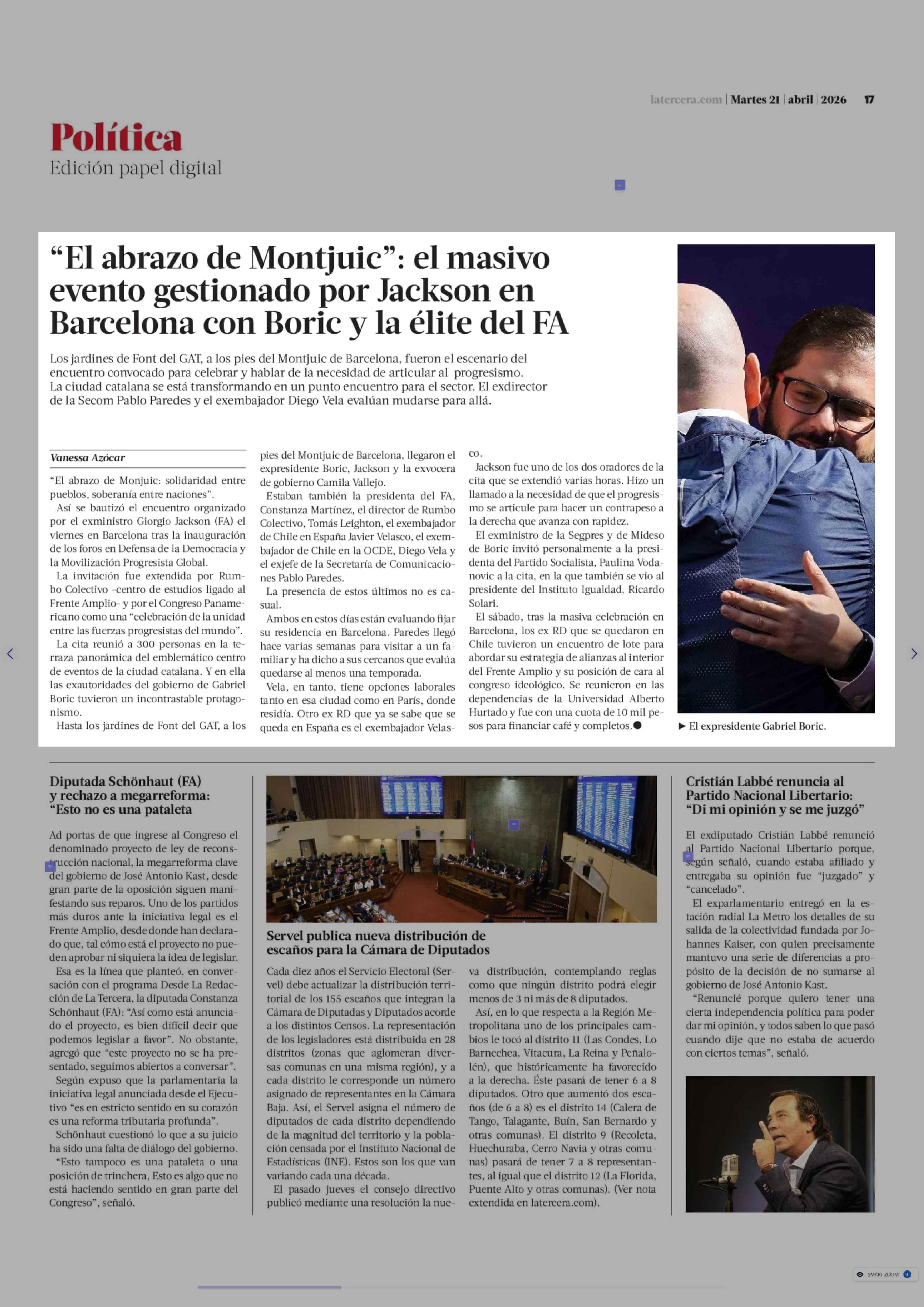 "El abrazo de Montjuic": el masivo evento gestionado por Jackson en Barcelona con Boric y la élite del FA 21-04-2026 La Tercera |