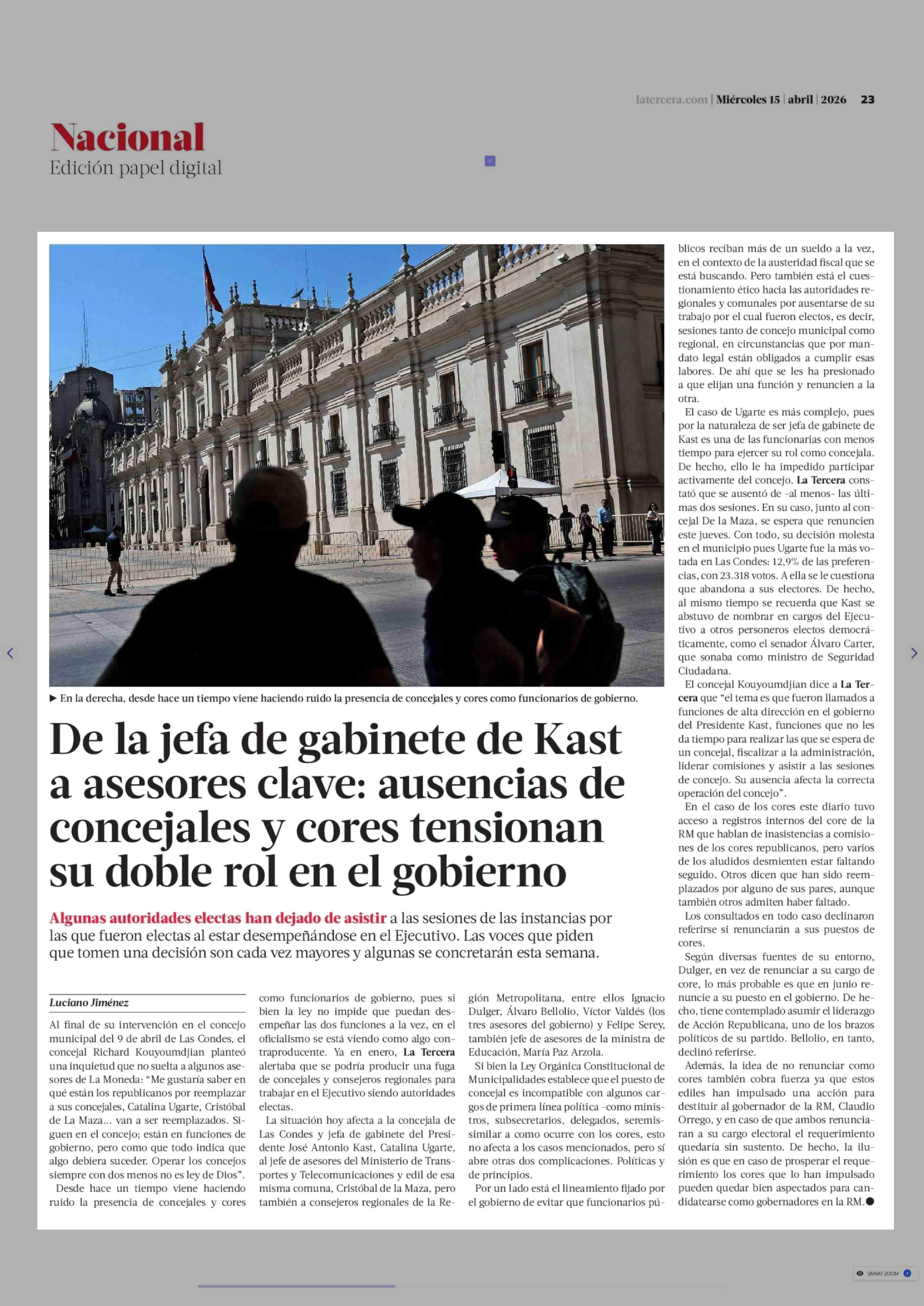 De la jefa de gabinete de Kast a asesores clave: ausencias de concejales y cores tensionan su doble rol en el gobierno 15-04-2026 La Tercera |