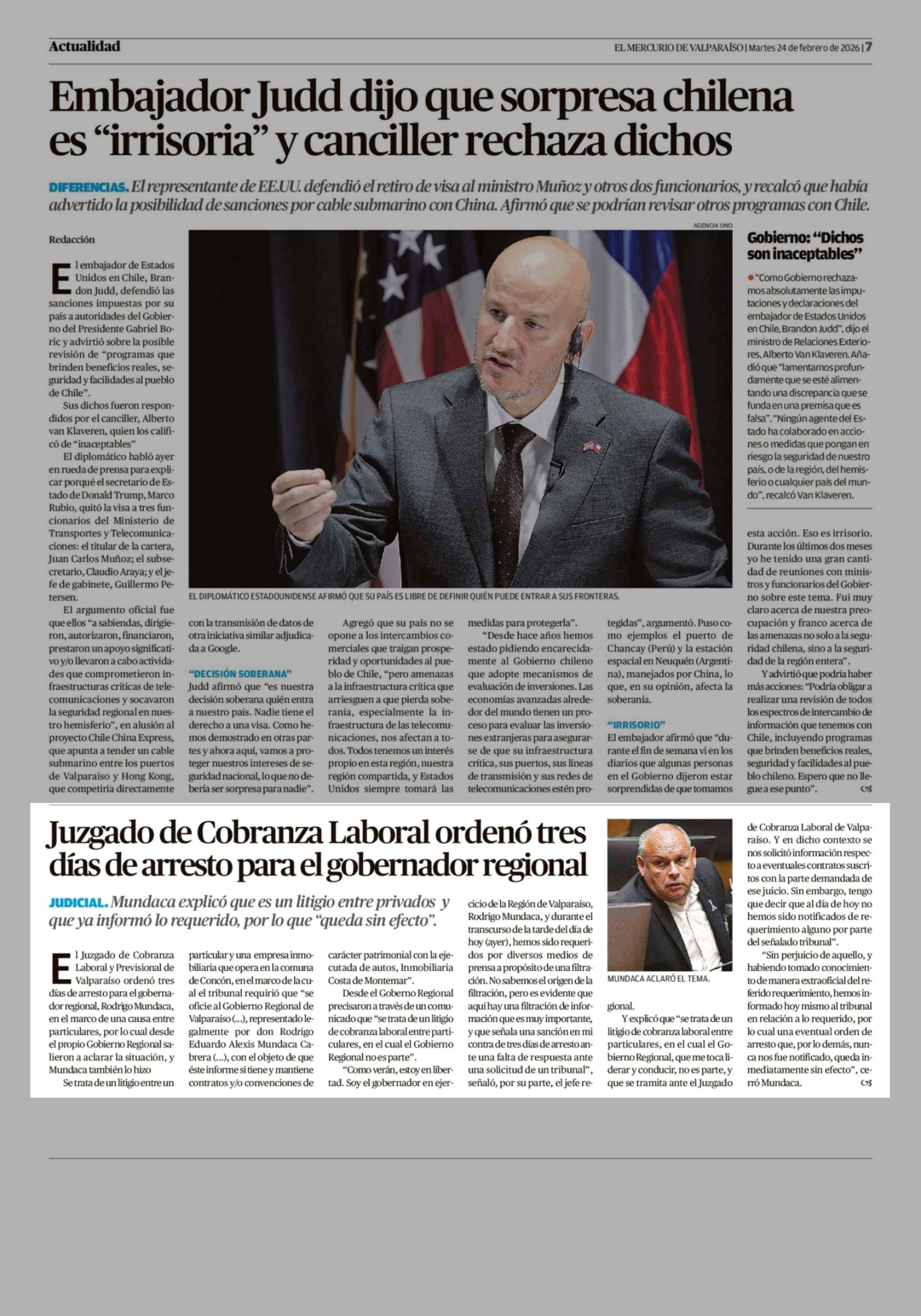 Juzgado de Cobranza Laboral ordenó tres días de arresto para el gobernador regional 24-02-2026 El Mercurio de Valparaíso |