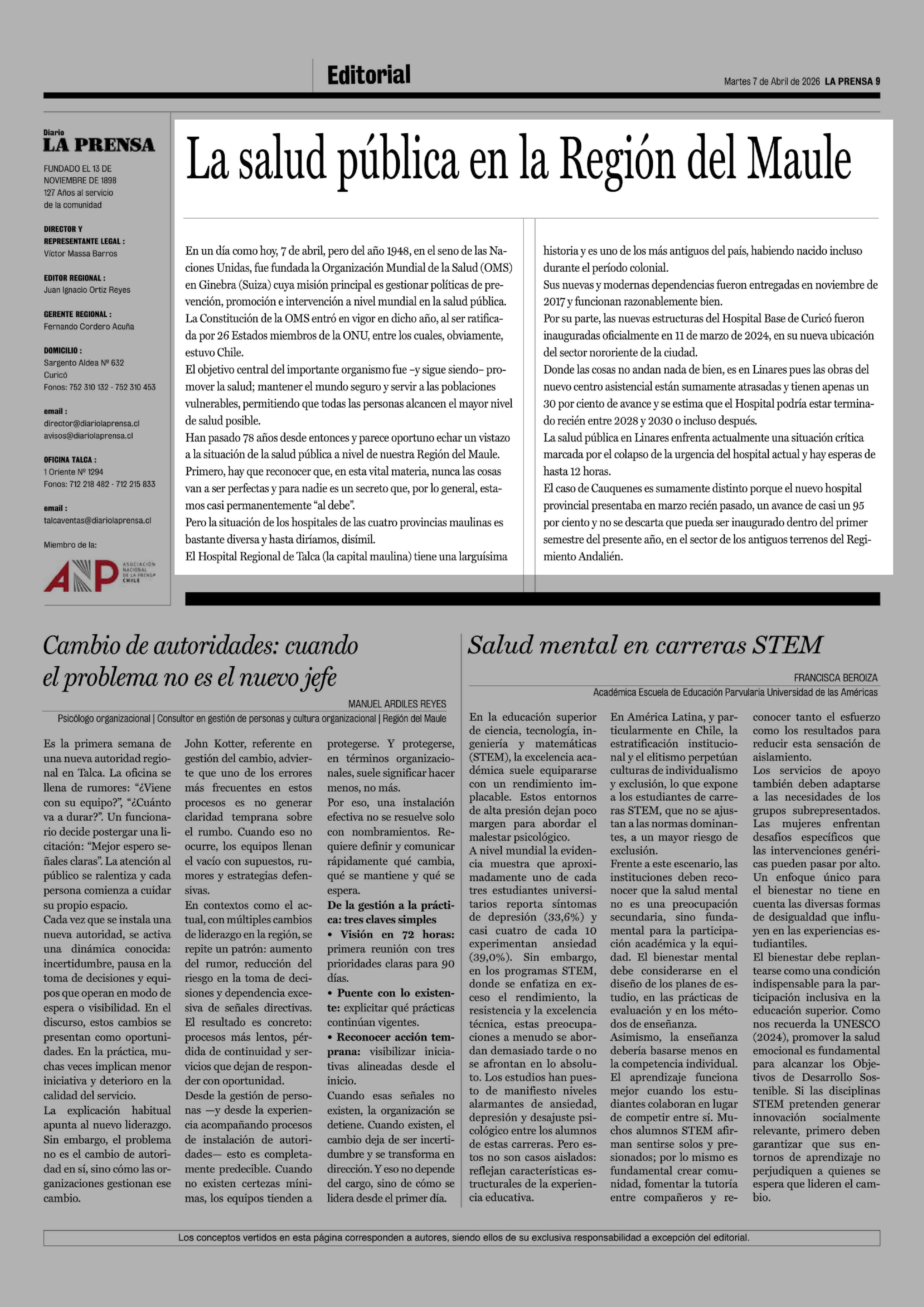 Editorial: La salud pública en la Región del Maule 07-04-2026 La Prensa de Curicó |