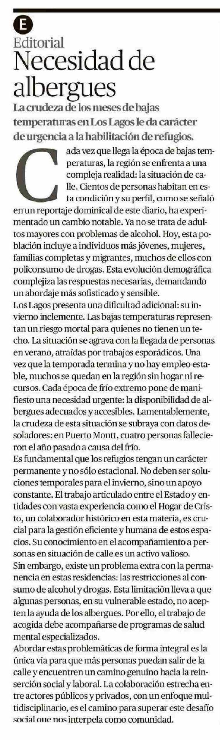 Editorial: Necesidad de albergues 10-06-2025 El Llanquihue |