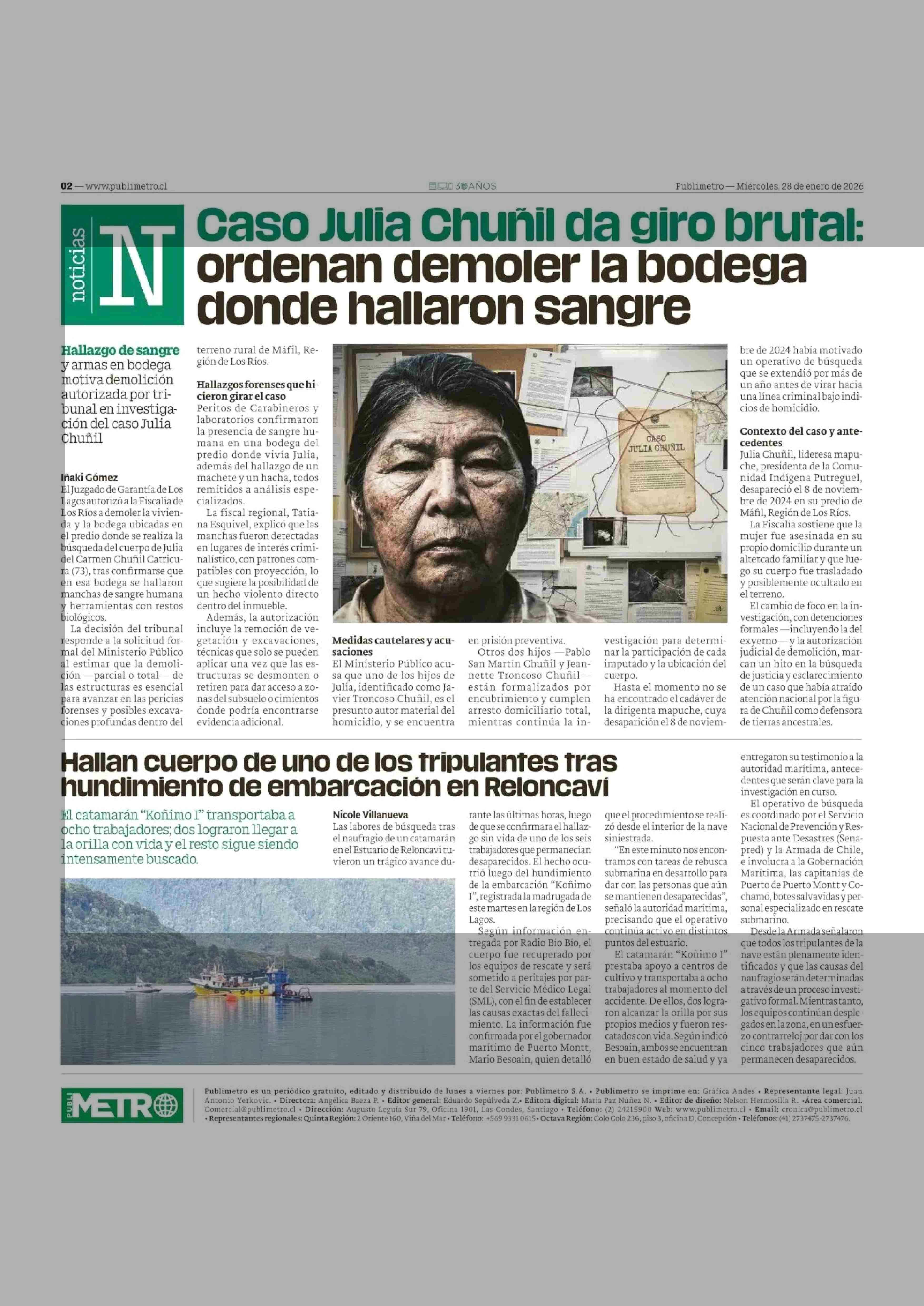 Caso Julia Chuñil da giro brutal: ordenan demoler la bodega donde hallaron sangre 28-01-2026 Publimetro |