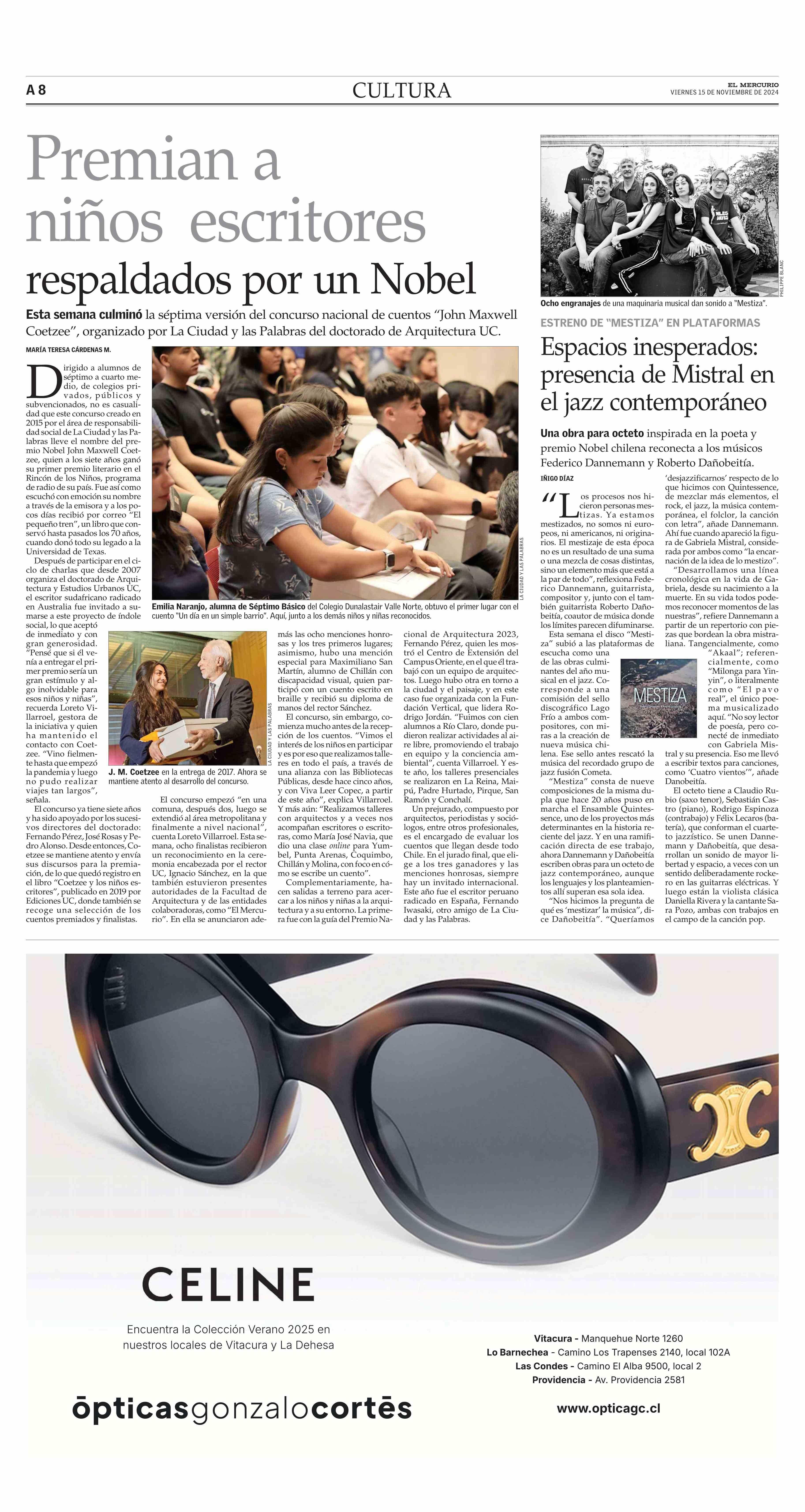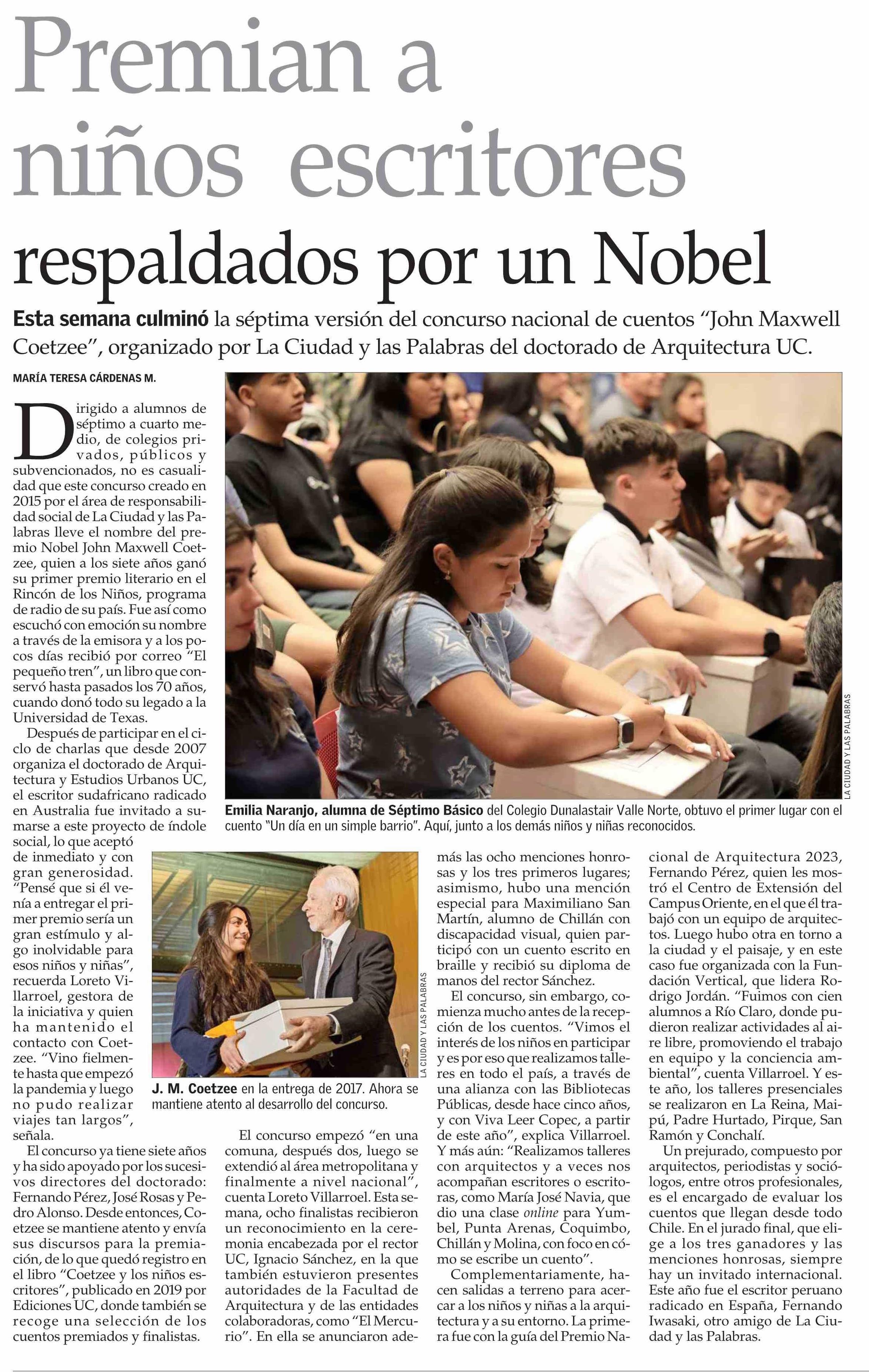Premian a niños escritores respaldados por un Nobel 15-11-2024 El Mercurio |