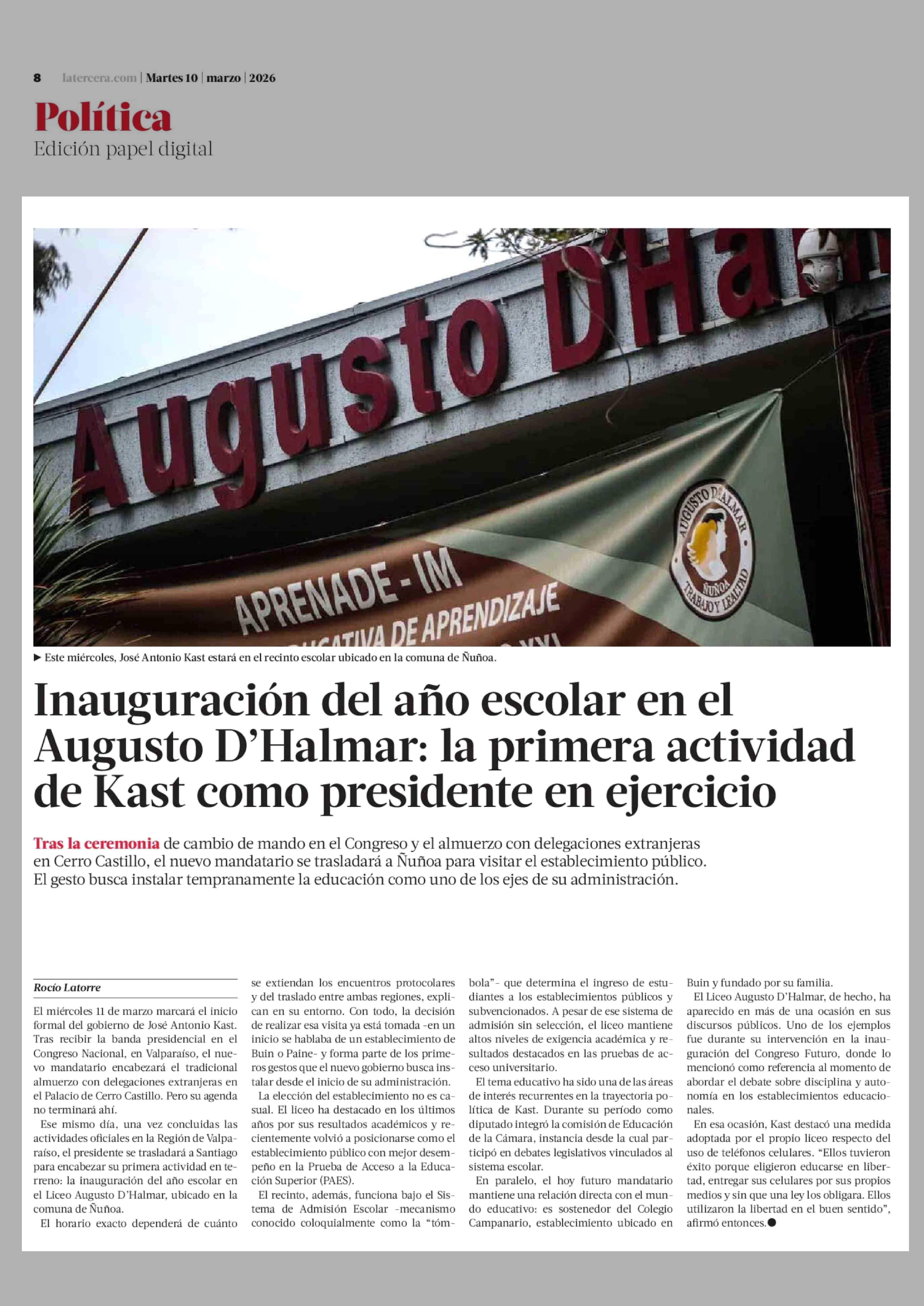 Inauguración del año escolar en el Augusto D'Halmar: la primera actividad de Kast como presidente en ejercicio 10-03-2026 La Tercera |